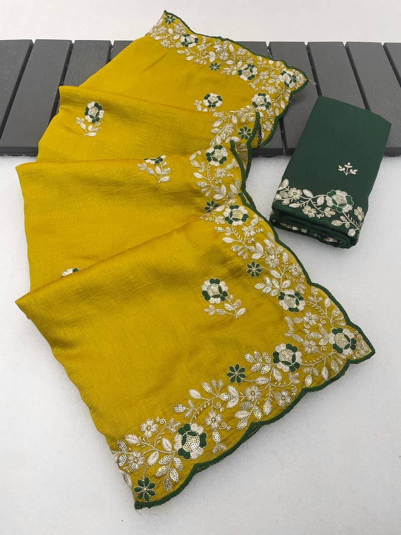 Yellow color amazing sequences thread embroidery work vichitra silk saree