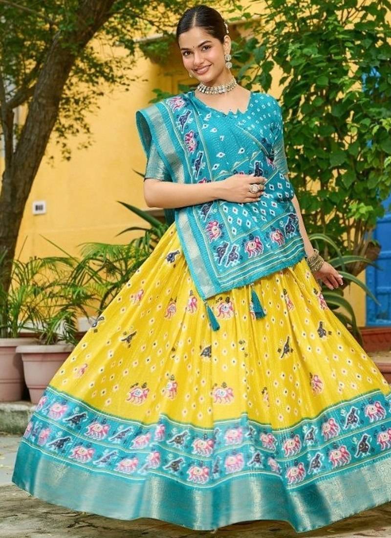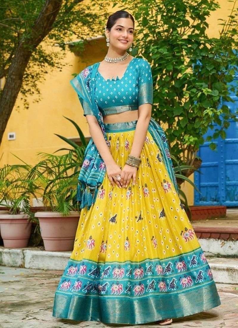 Yellow color print work jacquard lehanga choli set