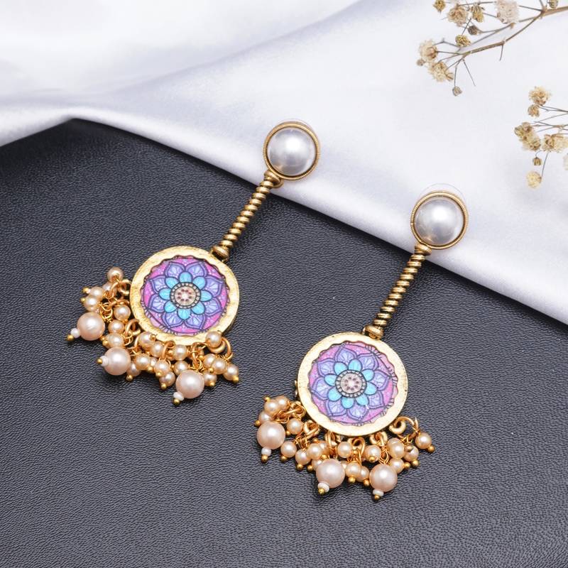 Abhika Creations Gold Toned Mandala Earrings With Pearl Stud & Clustered Pearl Fringe