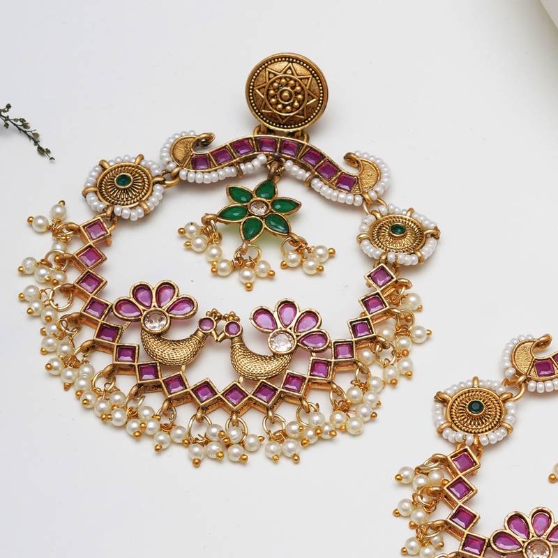 Abhika creations gold-toned peacock chandbali earrings with pink stones & pearl drops