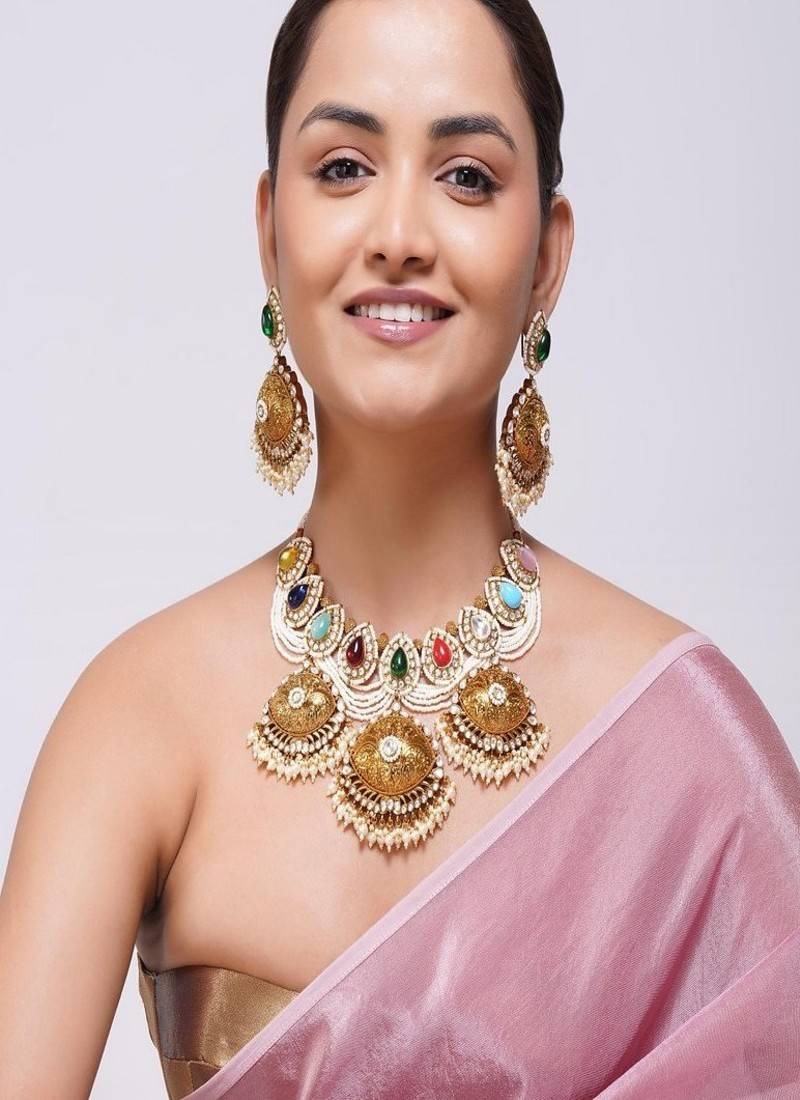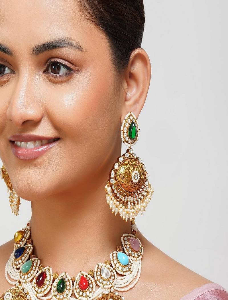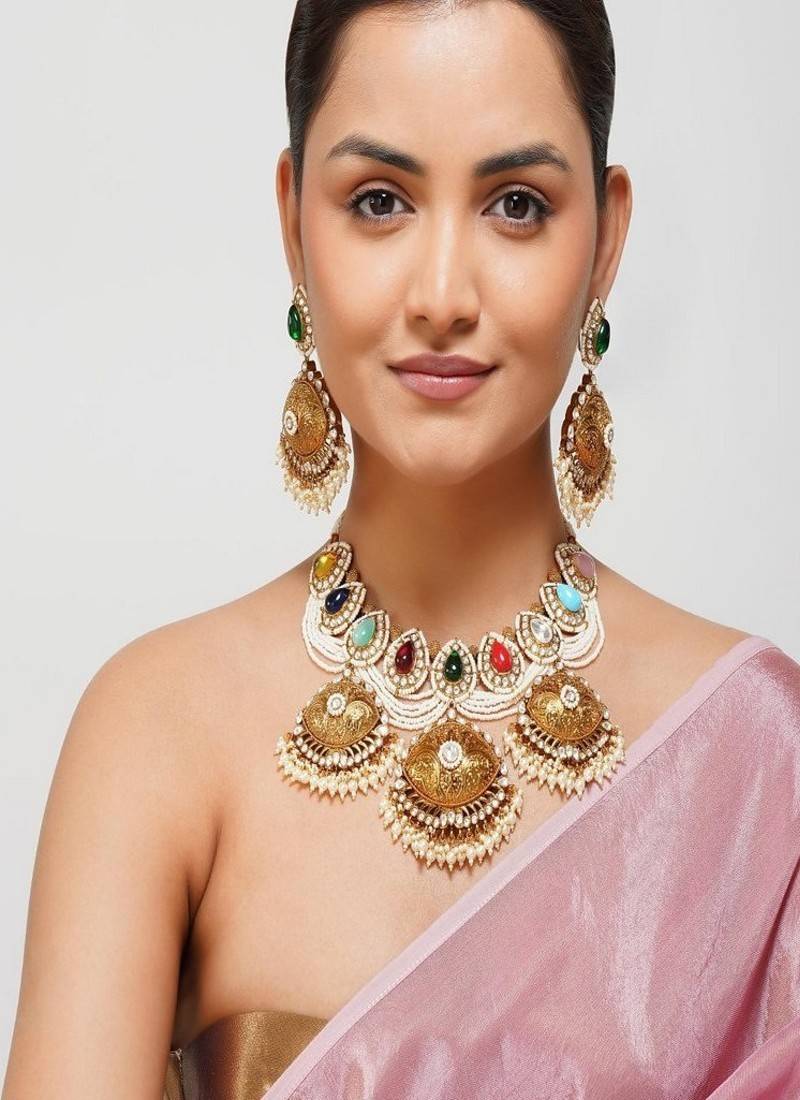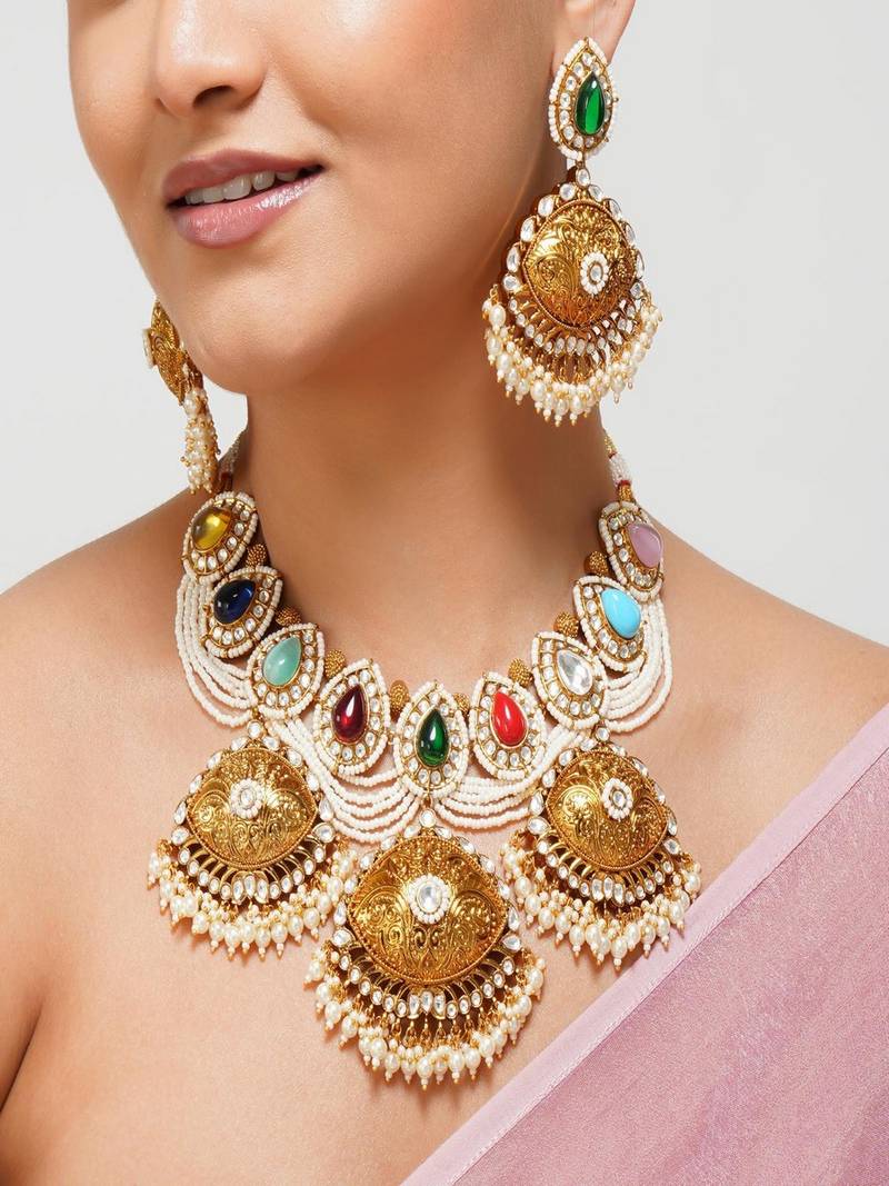 Product Description | Celebrate The Grandeur Of Punjabi Heritage With Our Kundan Navratan Necklace, An Exquisite Blend Of Tradition And Contemporary Design. The Necklace Is Beautifully Layered With Delicate Designer Pearls, Adding A Touch Of Grace And Sophistication To Its Antique Charm.