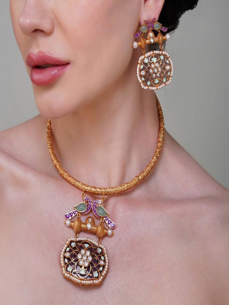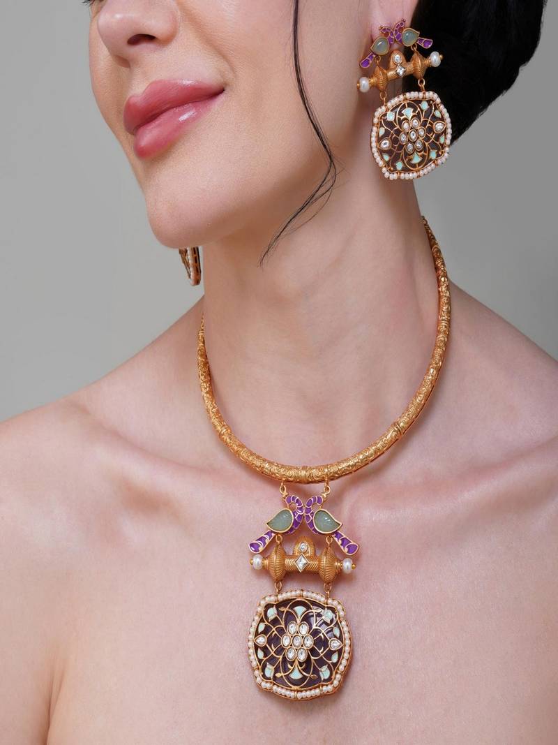 Product Description | Indulge In The Regal Allure Of The Dark Lavender Meena Kundan Jadau Fusion Halsi, Where Traditional Craftsmanship Meets Modern Sophistication. This Handcrafted Masterpiece Features Intricate Jadau Work, Adorned With Radiant Kundan Stones And Detailed Meena Enamel In A Deep, Enchanting Shade Of Lavender.