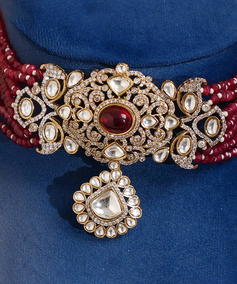Exude Elegance With This Designer Jadau Choker Set, Featuring A Luxurious Kundan Setting Adorned With Semi Precious Ruby Pearls. Handcrafted With Intricate Detailing, This Choker Embodies The Perfect Blend Of Traditional Heritage And Contemporary Design, Ideal For Weddings, Festive Occasions, And Special Celebrations.