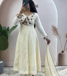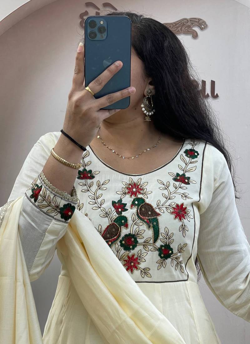 Cream pure roman chanderi silk anarkali suit with dupatta stitched