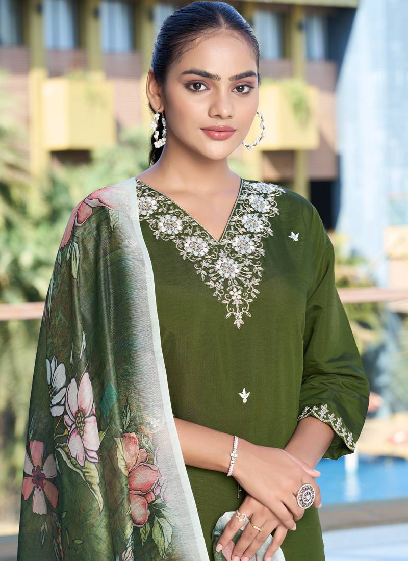 Green roman silk kurti pant dupatta set stitched
