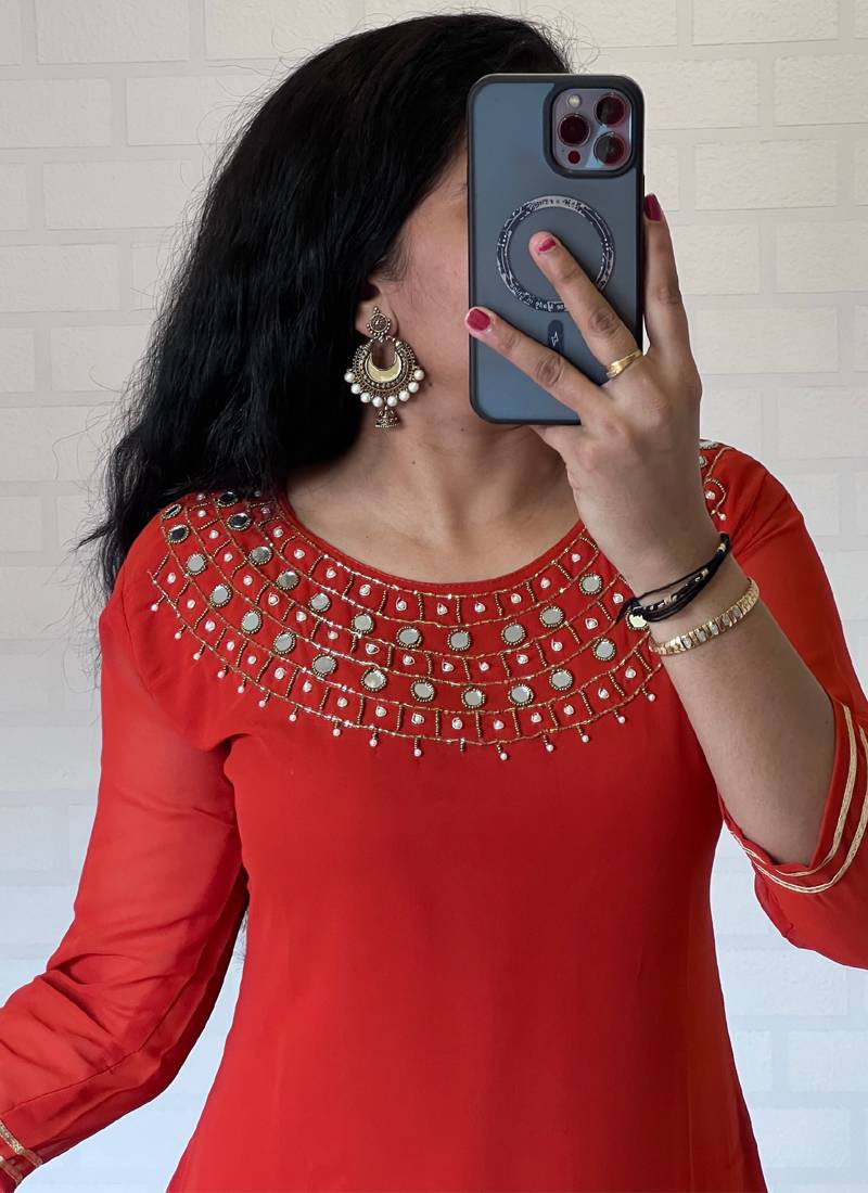 | Product Description | Step Into Elegance With This Beautifully Designed Kurti Crafted In Premium Blooming Georgette, Featuring Intricate Double Mirror Handwork On The Front And Stunning Gota Patti Designer Sleeves. Perfect For Festive Occasions, Parties, And Traditional Gatherings.