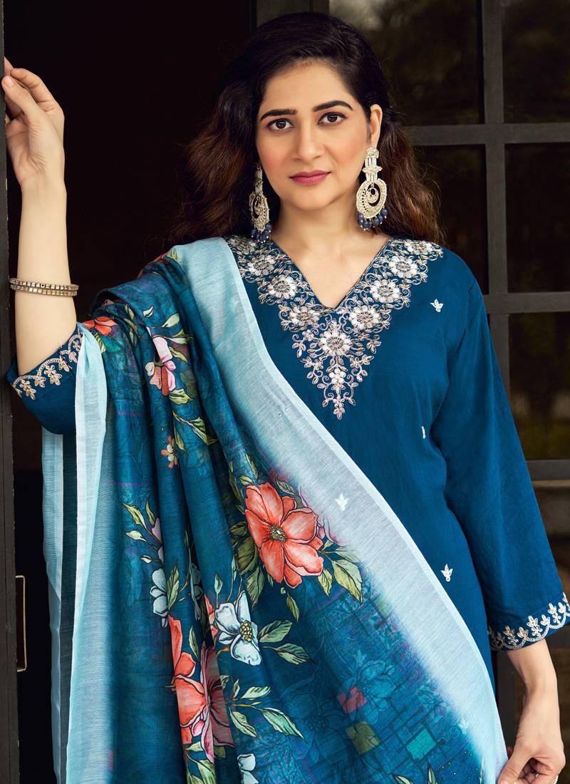 | Product Description | *Kurti : Roman Silk With Beautiful Embroidery With Sequence Work* ?? *Pent : Roman Silk* *Dupatta : Chanderi Silk With Digital Print And Tassels (2.20 Mtr)* *Inner : Cotton* *Color : Teal Blue* *Inclusive : Top Bottom Dupatta (3 Pcs)* |