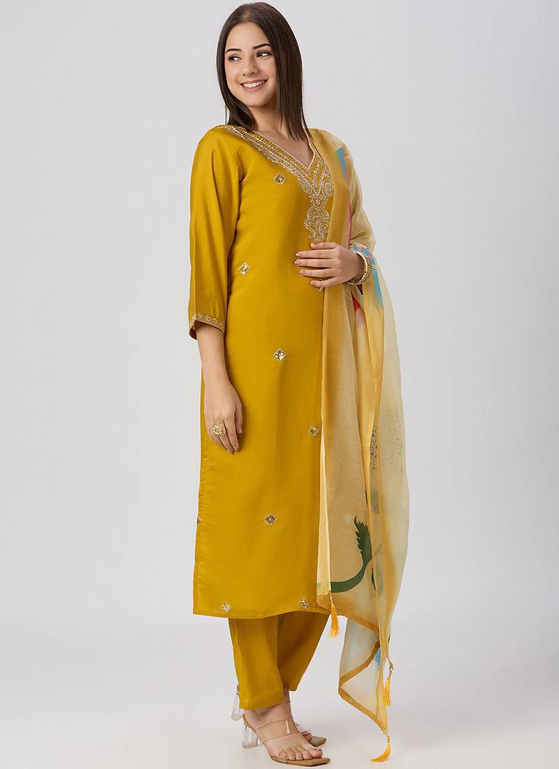 Yellow roman silk kurti pant dupatta set stitched