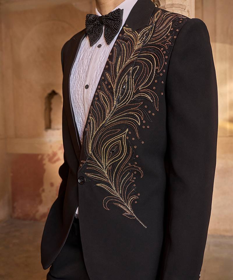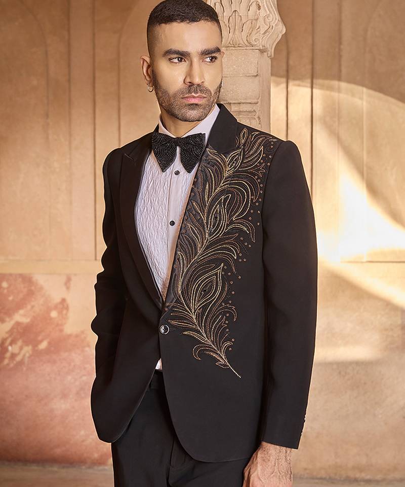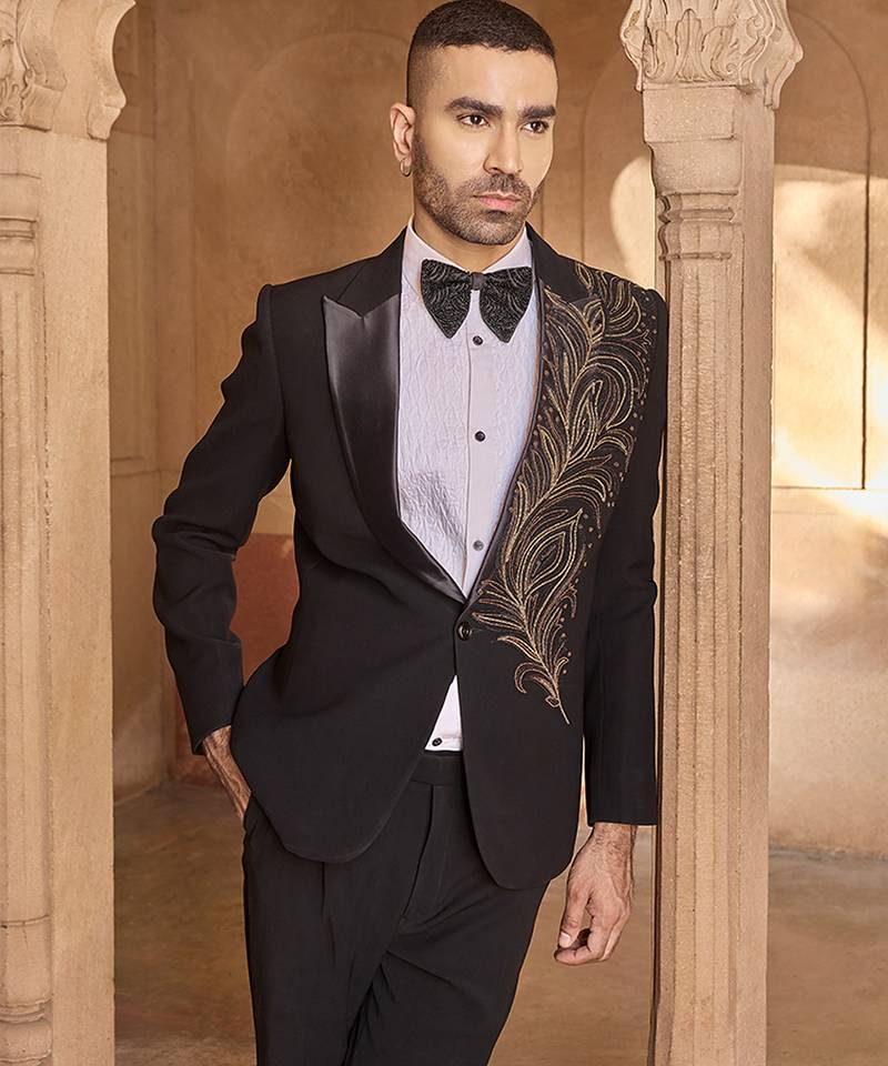 This Velvet Tuxedo In Black Is Adorned With Refined Embroidery For A Regal Finish. The Rich Texture And Structured Design Provide A Striking Formal Look, Ideal For Wedding Receptions And High Profile Festive Occasions.