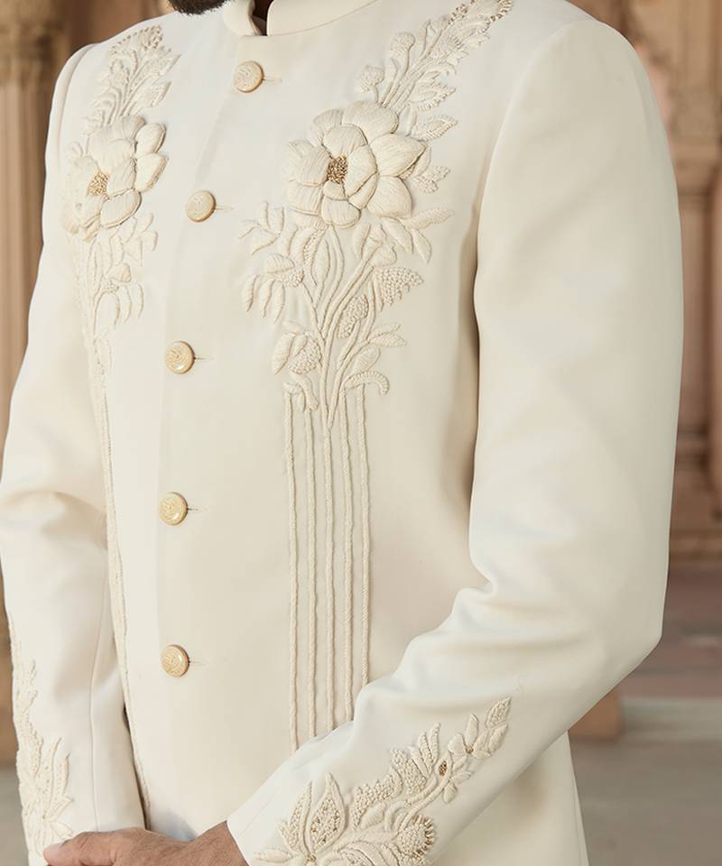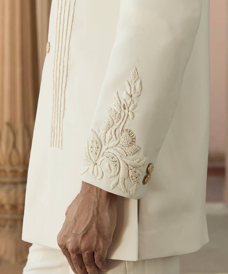 Ivory embroidered crepe silk bandhgala set