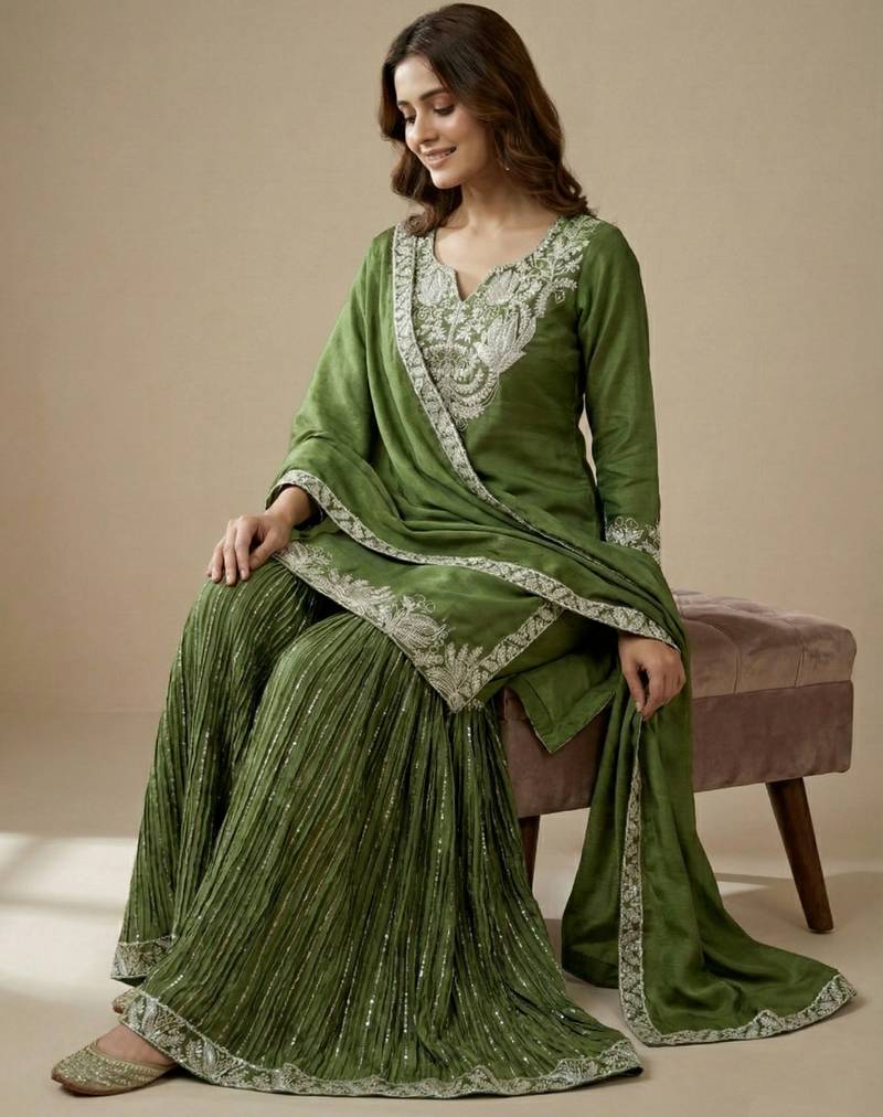 | • | Bottom | : | Color- Mehendi / Fabric- Faux Silk |