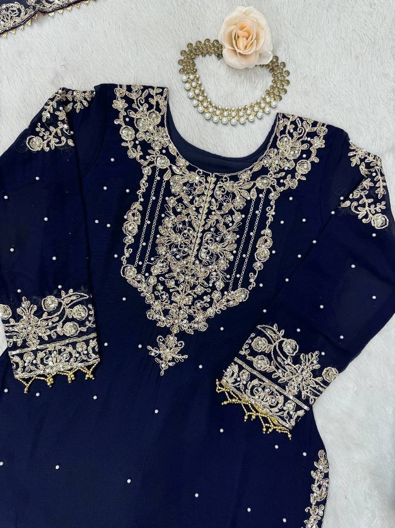 | • | Kameez | : | Color- Navy Blue / Fabric- Faux Georgette |