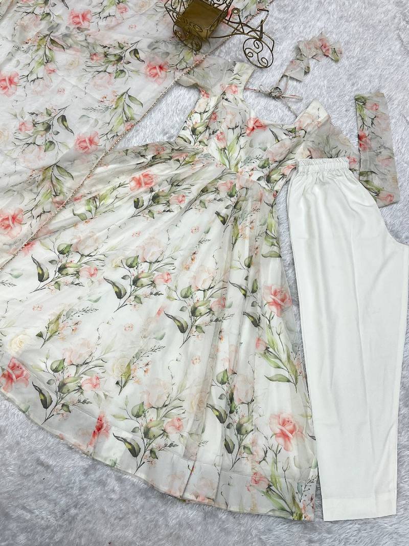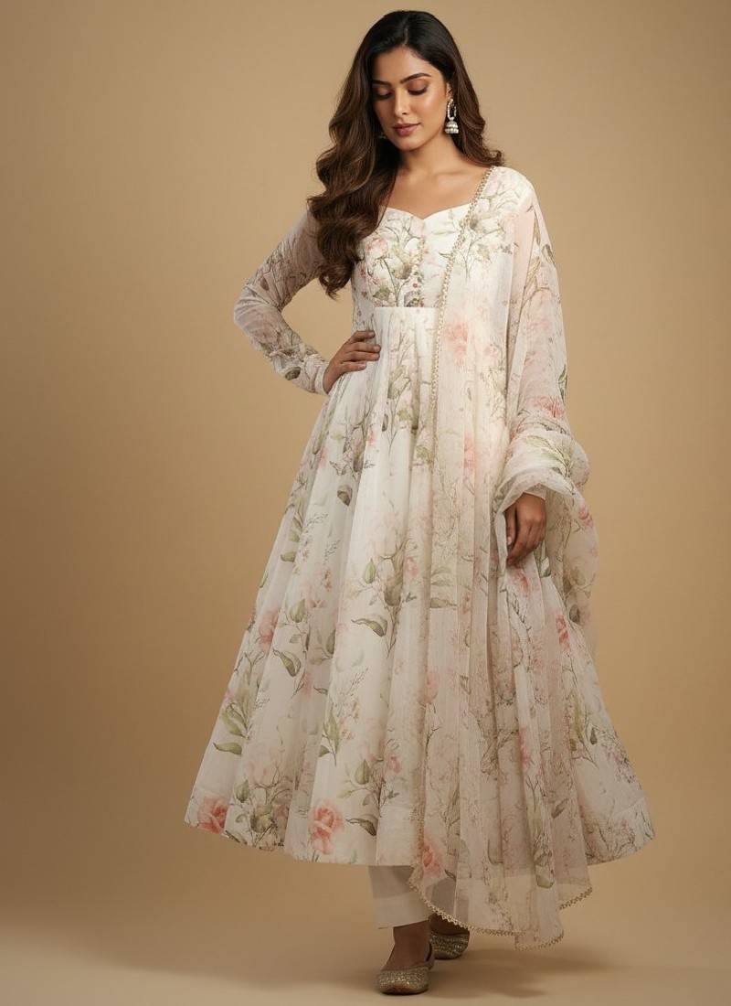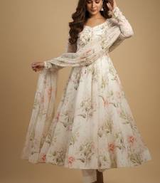 Off-white printed pure organza salwar suit stitched