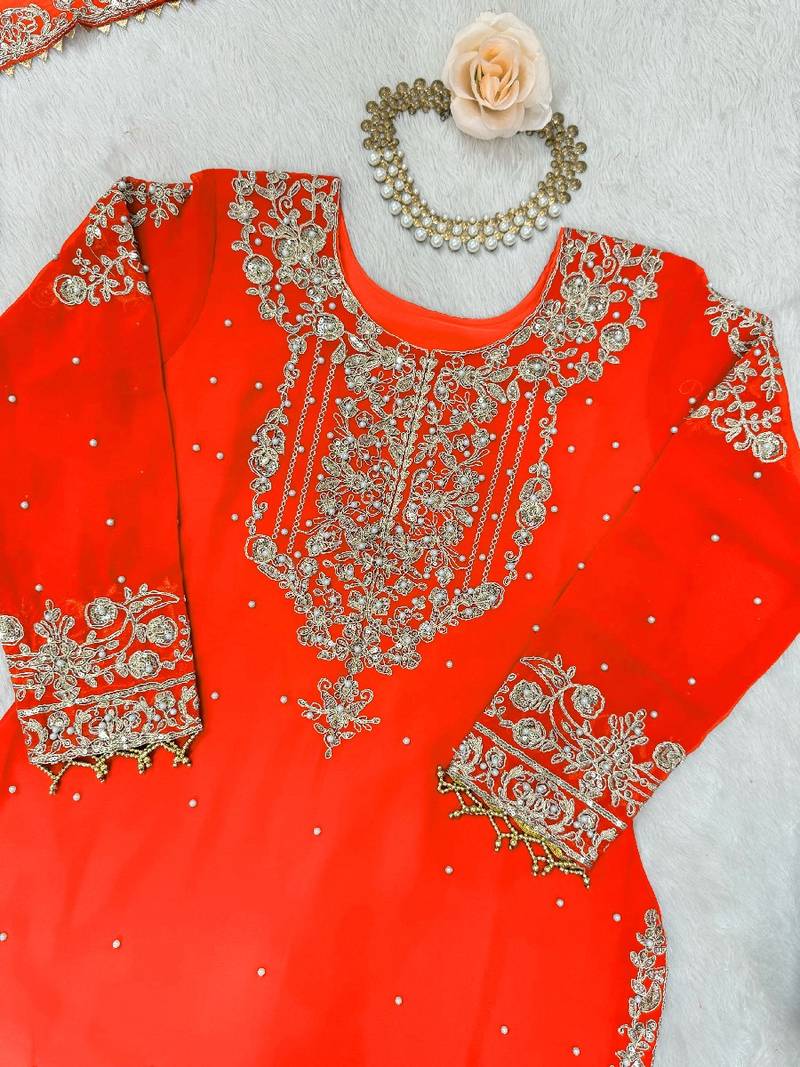 | • | Kameez | : | Color- Orange / Fabric- Faux Georgette |