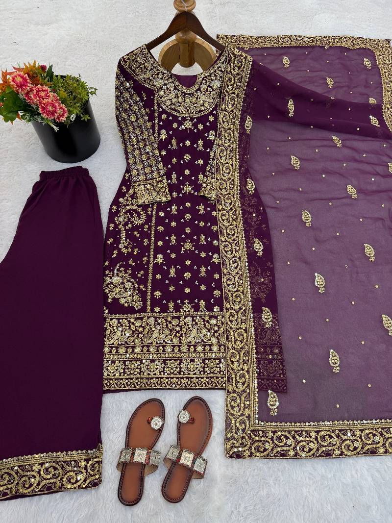 Purple sequins faux georgette salwar suit stitched