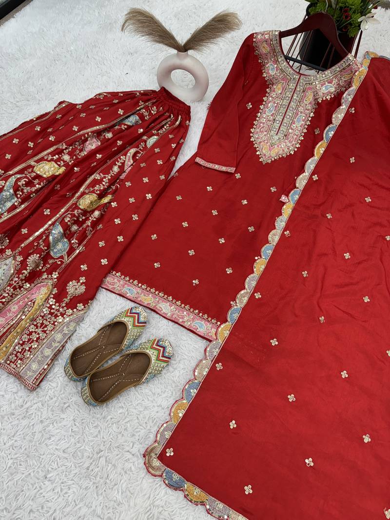 Red designer faux silk readymade designer suit stitched