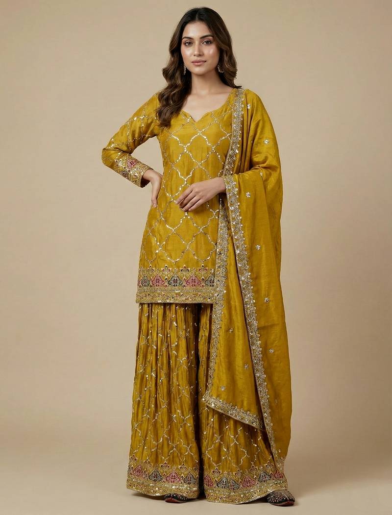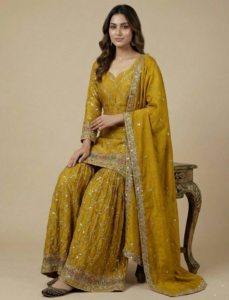 | • | Kameez | : | Color- Yellow / Fabric- Faux Silk |