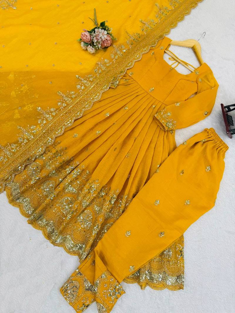 Yellow thread embroidery silk blend salwar suit stitched
