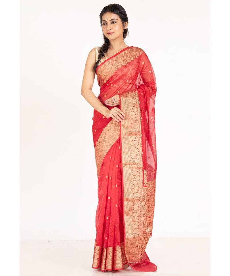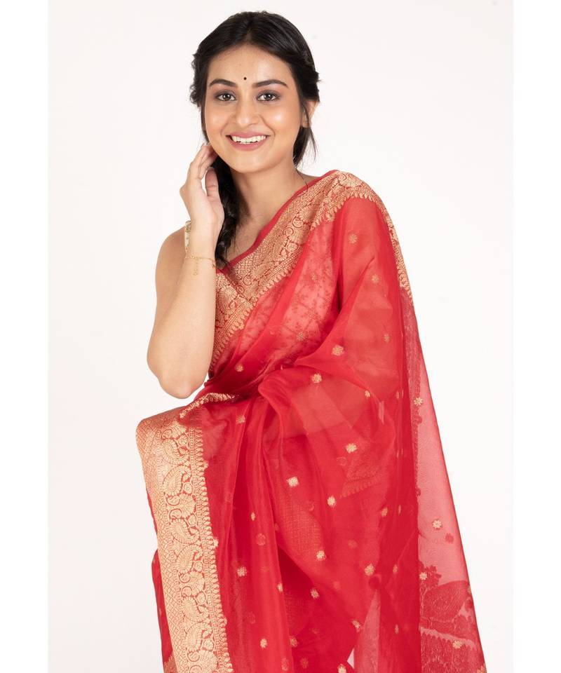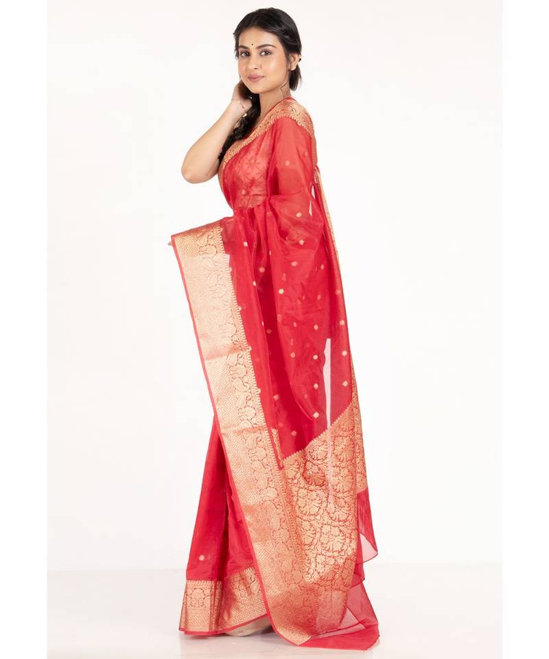 Red kora organza banarasi silk saree with golden border and woven pallu