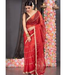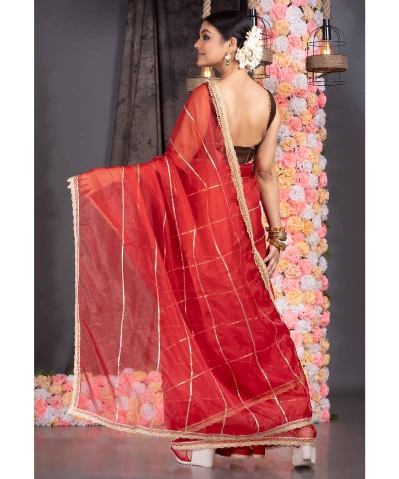 Red organza saree with gota work and scallop border