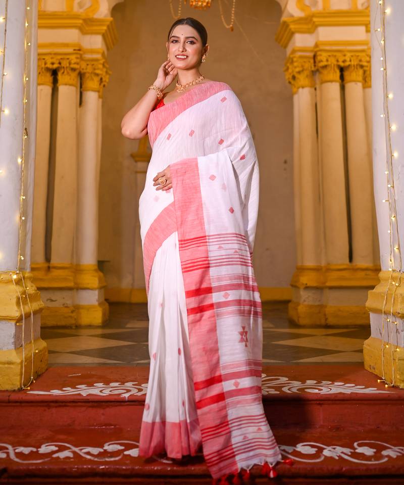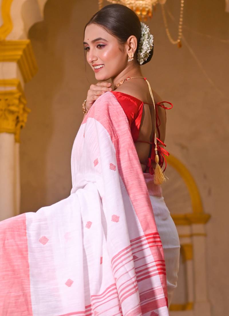 | Product Name | White And Red Pure Handloom Cotton Saree With Red Border And Stripe | |