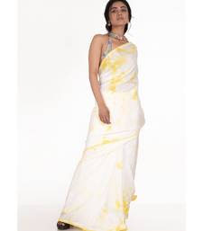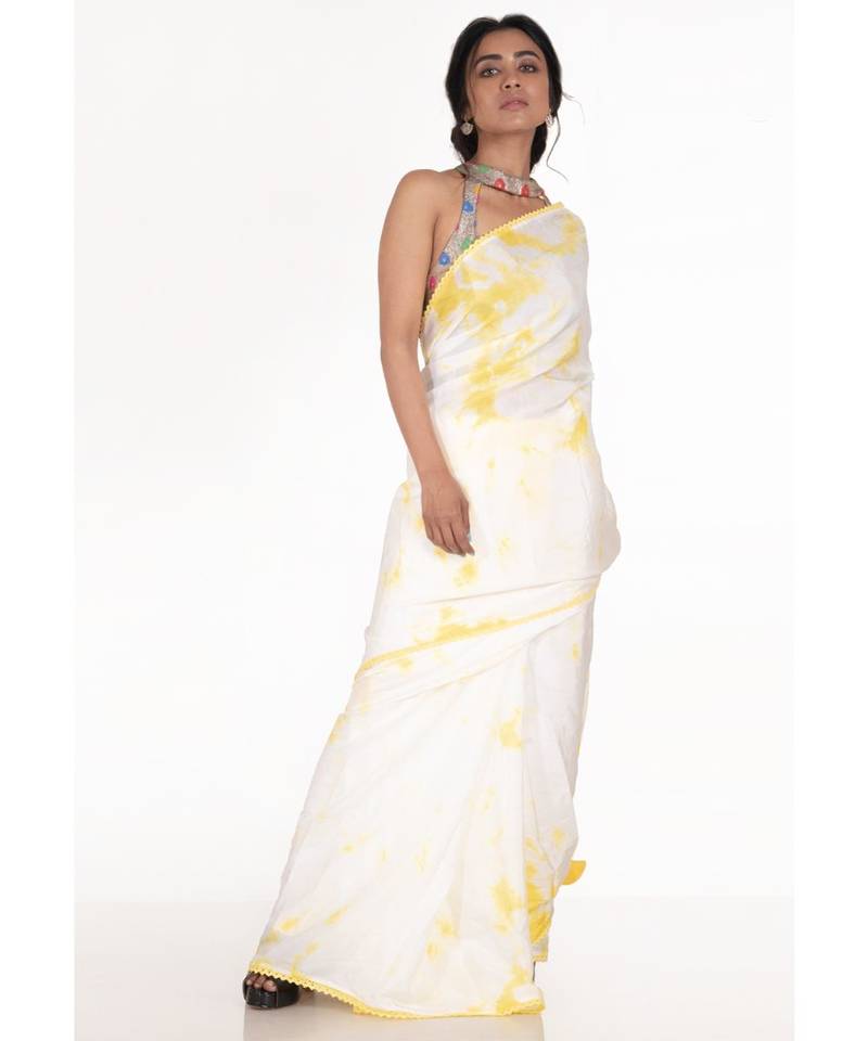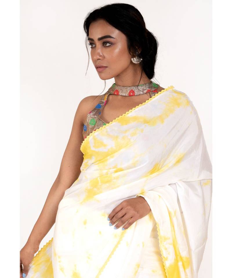 White and yellow tie and dye habutai silk saree with cotton lace border