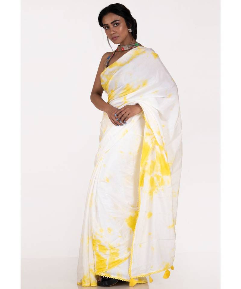 | Product Name | White And Yellow Tie And Dye Habutai Silk Saree With Cotton Lace Border | |