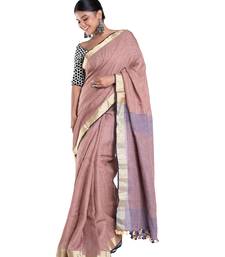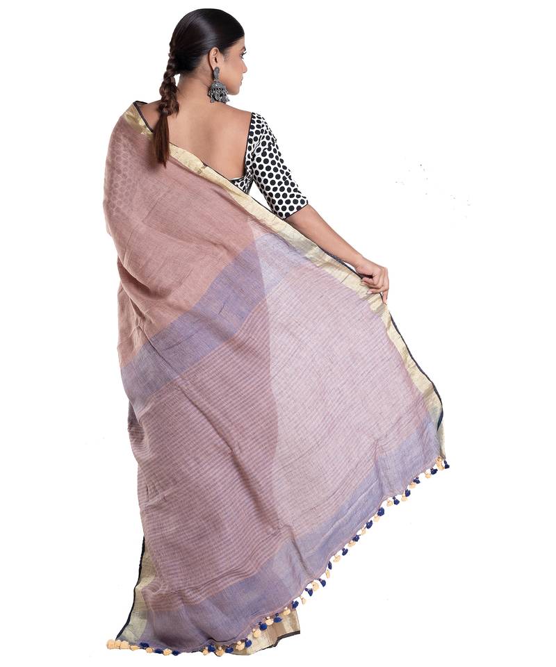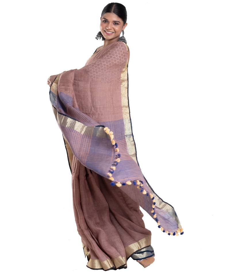 Wood brown linen saree with zari border pallu