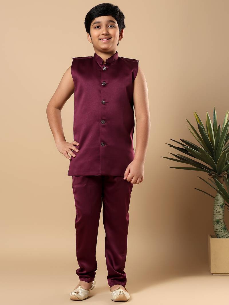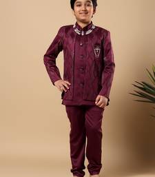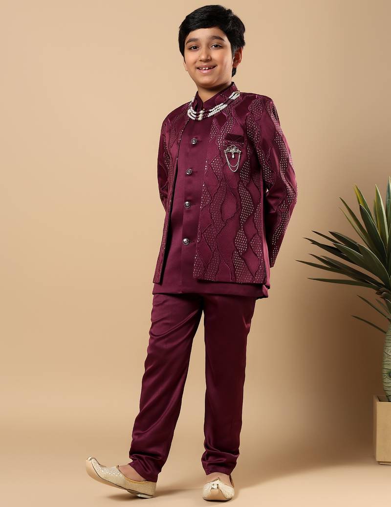 | Product Name | Boys Burgundy Satin Wavy Embroidered Sequined Sherwani & Trouser Set With Shrug And Necklace | |