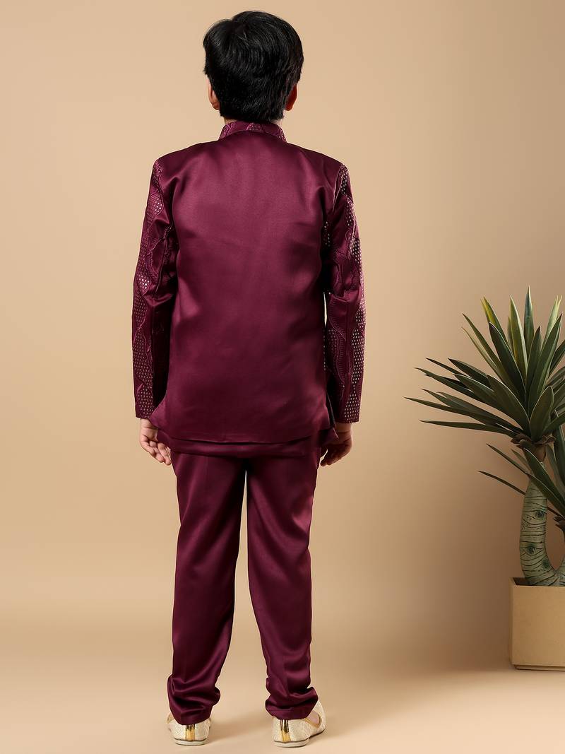 Boys burgundy satin wavy embroidered sequined sherwani & trouser set with shrug and necklace