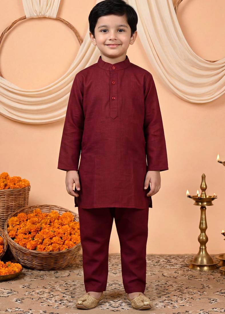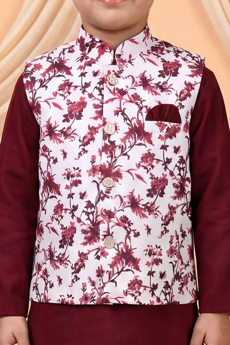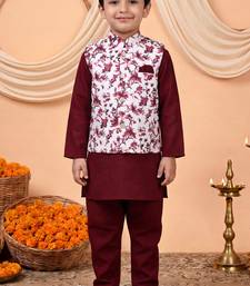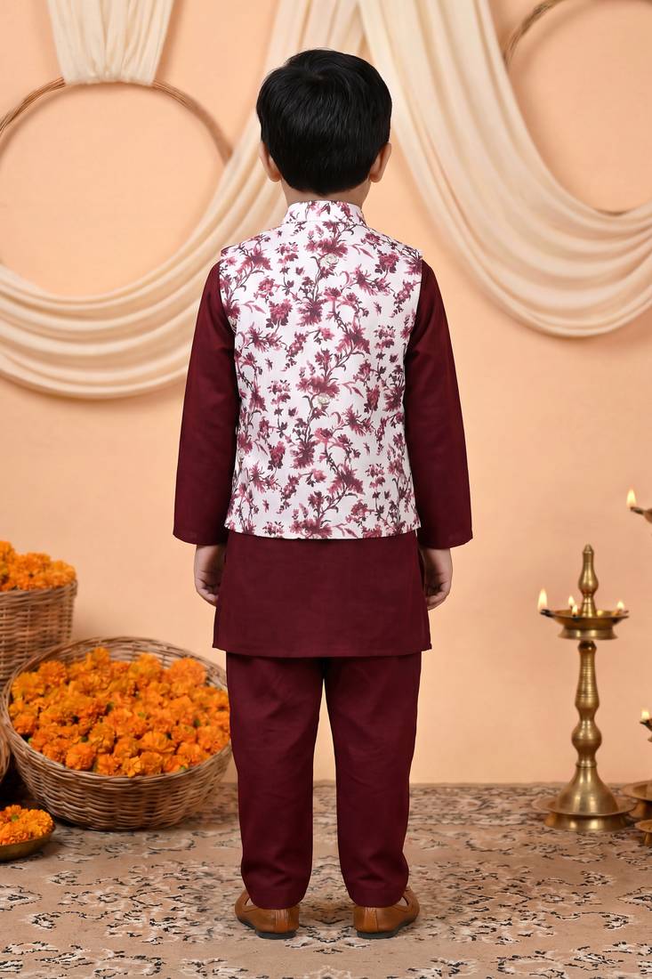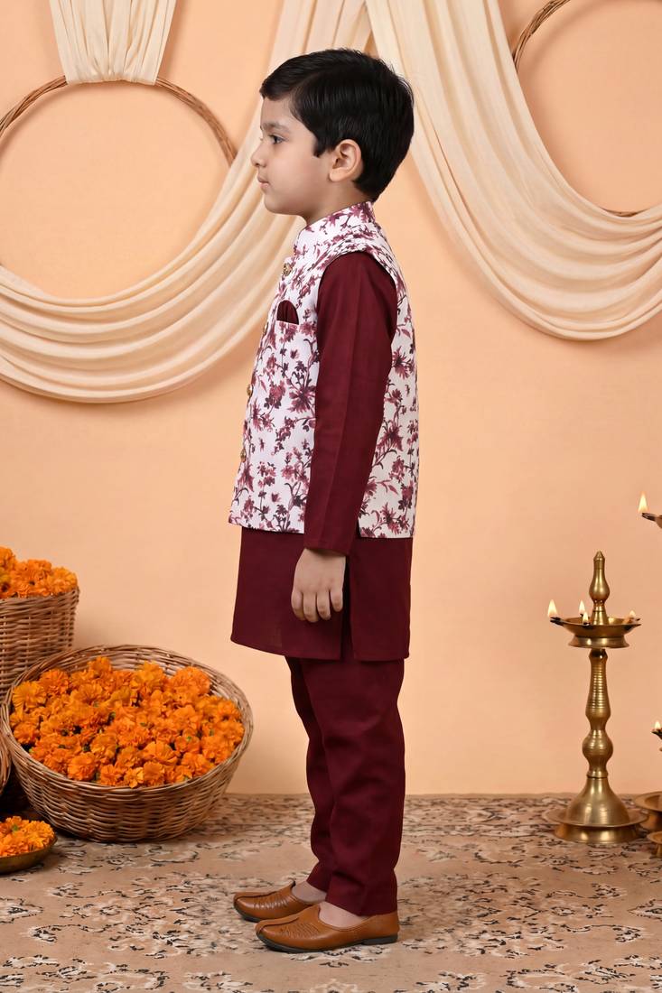 | Product Name | Boys Maroon Cotton Blend Kurta Pyjama Set With Floral Vine Printed Waistcoat | |
