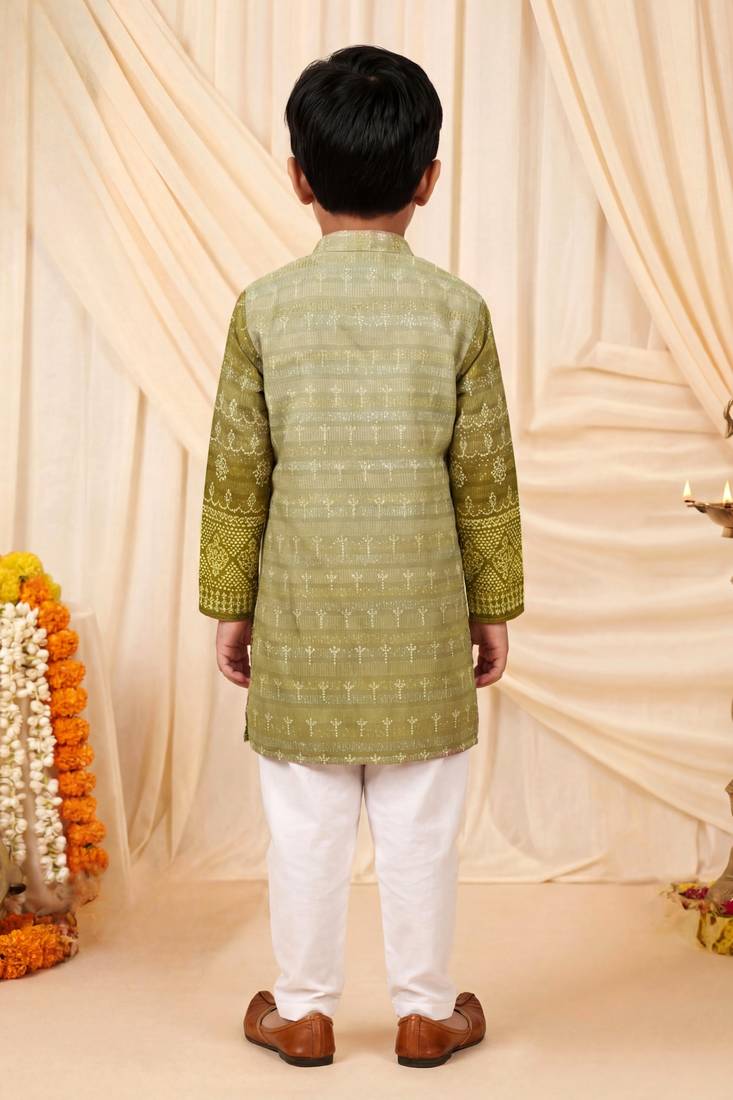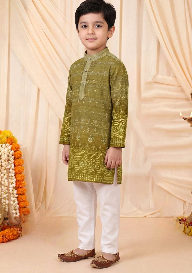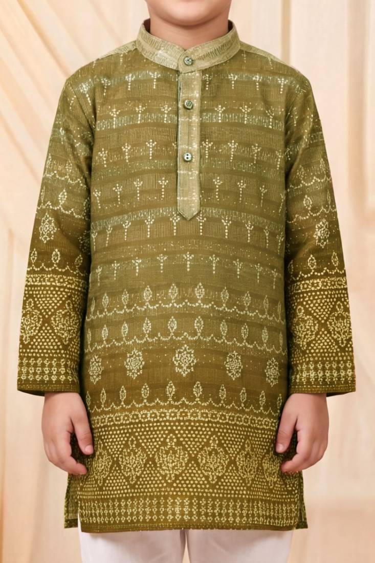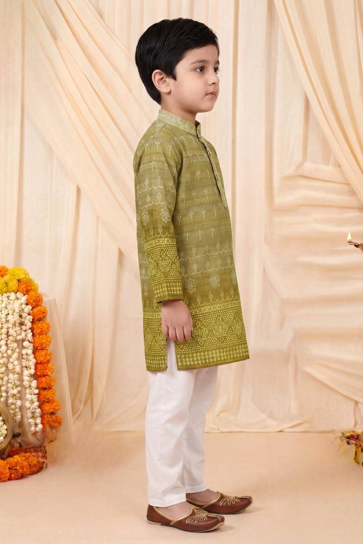 | Product Name | Boys Olive Green Premium Rayon Heritage Bandhani Motif Print Kurta Pyjama Set | |