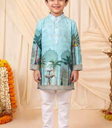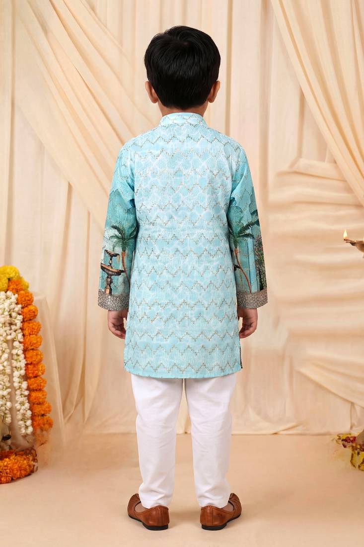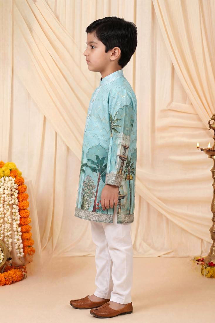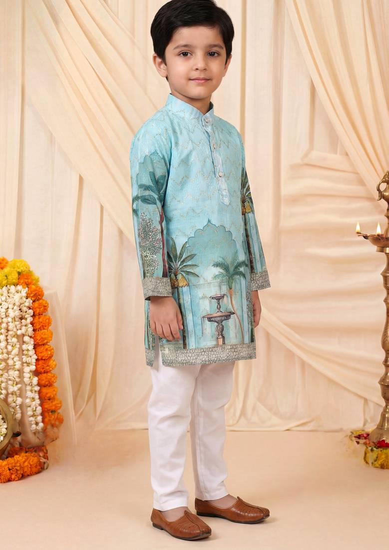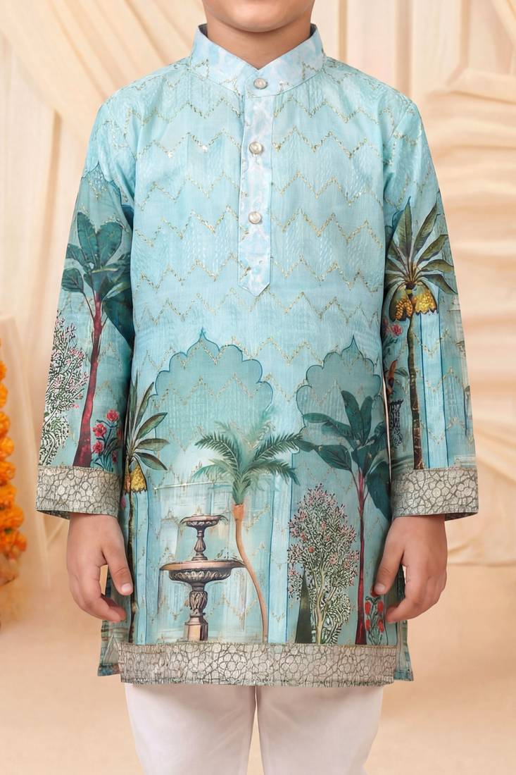 | Product Name | Boys Sea Green Rayon Royal Garden Scenic Print Kurta Pyjama Set With Zigzag Embroidery | |