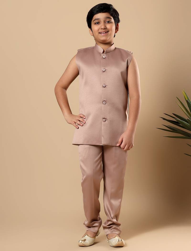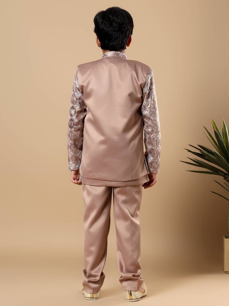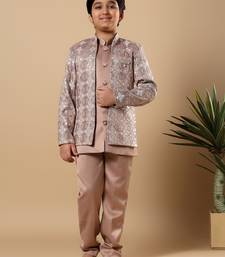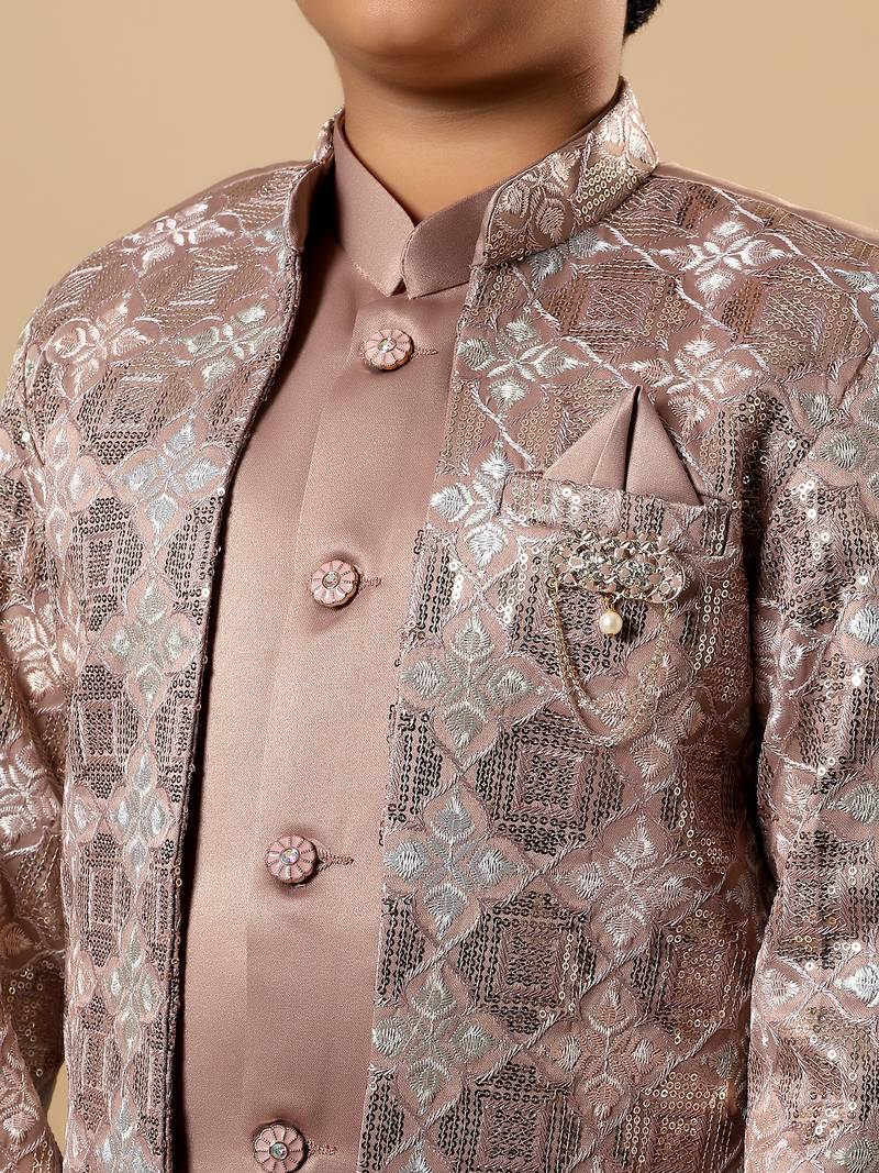 | Product Name | Boys Taupe Brown Satin Geometric Diamond Jaal Embroidered Sequined Sherwani & Trouser Set With Shrug | |