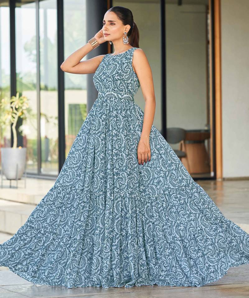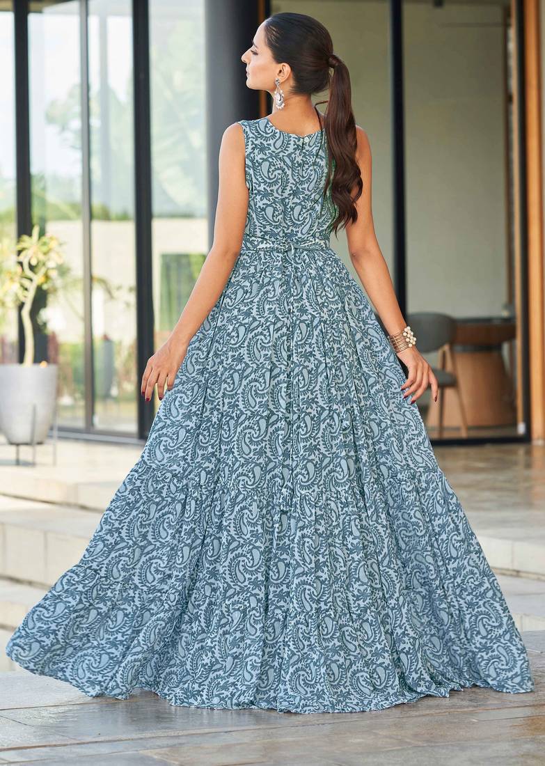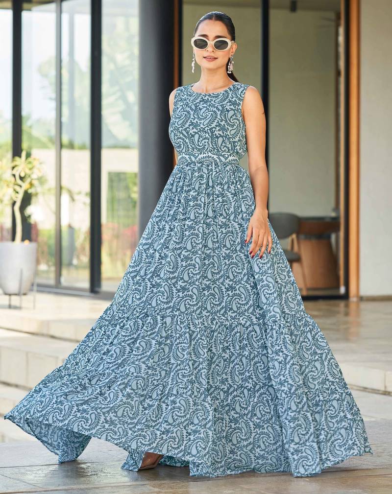 | Product Description | This Elegant Dusty Blue Maxi Dress Showcases A Timeless Paisley Print With A Classic Sleeveless Silhouette. Designed With A Clean Round Neckline And A Fitted Bodice That Flows Into A Beautifully Flared Umbrella Style Skirt, It Offers Comfort With Refined Ethnic Charm—Perfect For Festive Days And Casual Occasions. |