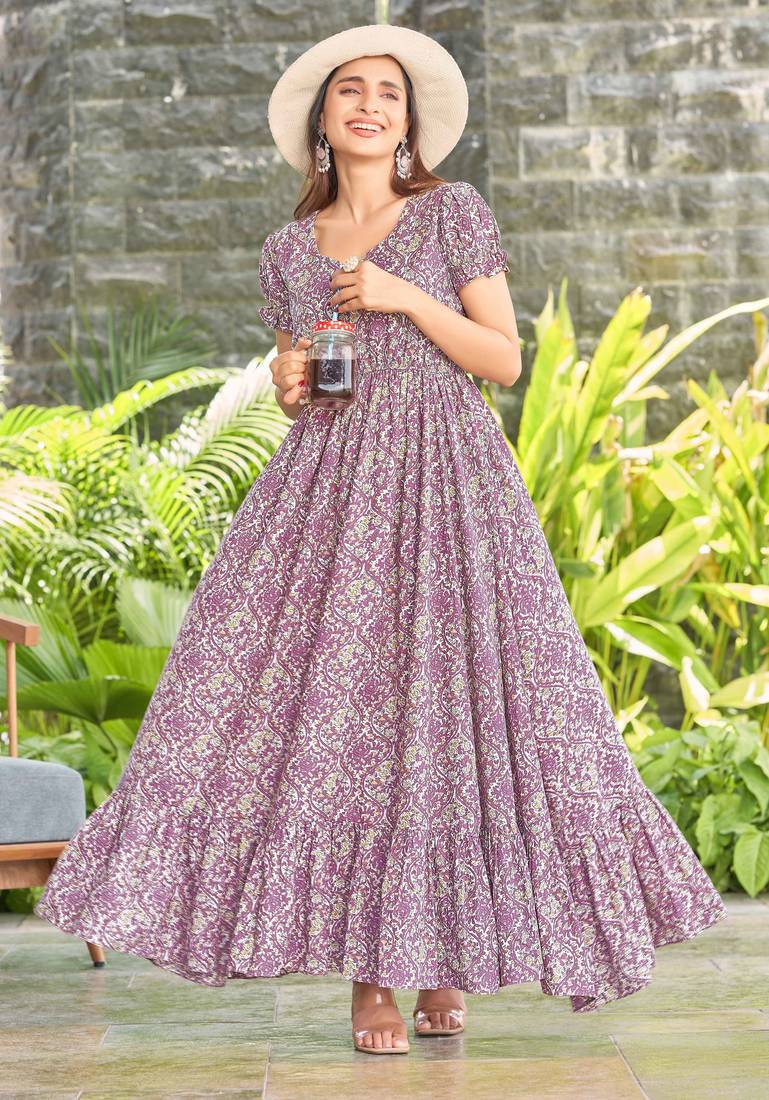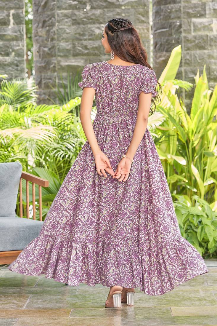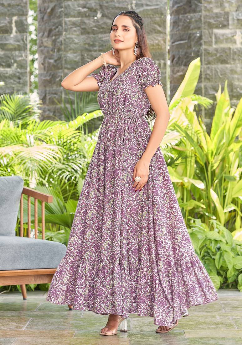 | Product Description | Step Into Effortless Elegance With This Beautiful Purple Printed Maxi Dress, Designed To Offer A Graceful And Feminine Look. Featuring A Flattering V Neckline And Short Puff Sleeves, This Dress Showcases A Flowy Flared Silhouette That Adds Movement And Charm. The All Over Traditional Inspired Print Makes It A Perfect Pick For Festive Occasions, Casual Gatherings, And Daytime Celebrations. |