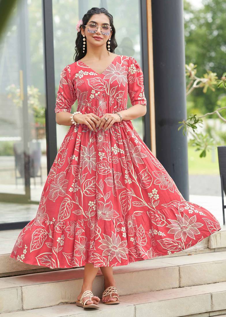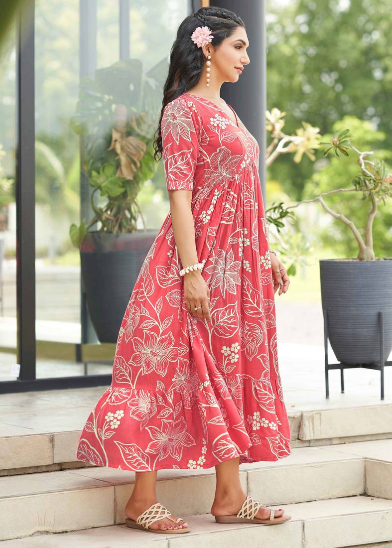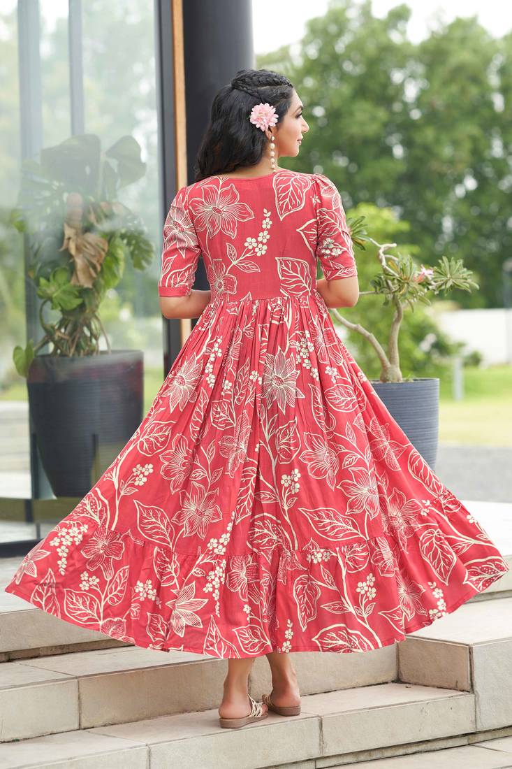 | Product Description | Add A Vibrant Touch To Your Everyday Ethnic Wardrobe With This Elegant Red Printed Flared Dress, Crafted For Comfort And Timeless Style. Designed In Soft, Breathable Fabric, This Dress Features A Flattering V Neckline, Comfortable Half Sleeves, And A Gathered Waist That Creates A Beautifully Flowy Silhouette. The Bold Red Base Enhanced With Contrasting Floral Prints Gives It A Lively Yet Graceful Appeal, While The Calf Length Flared Hem Ensures Ease Of Movement And A Stylish Finish. Perfect For Casual Outings, Daytime Celebrations, Office Wear, Or Relaxed Festive Occasions, This Versatile Dress Pairs Effortlessly With Ethnic Jewellery And Flats Or Sandals For A Polished, Effortless Look. |