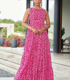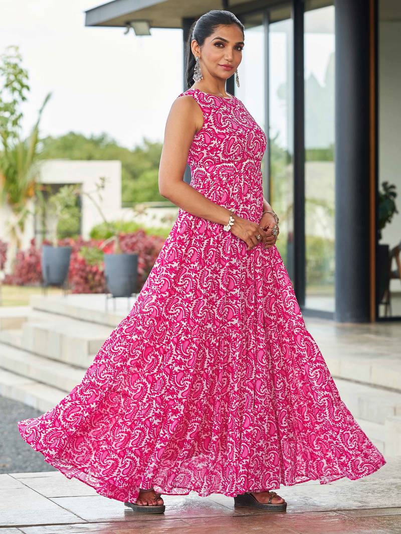 | Product Description | Elevate Your Ethnic Wardrobe With This Vibrant Rani Pink Maxi Dress Featuring A Classic Paisley Print. Designed With A Sleeveless Silhouette And A Clean Round Neckline, The Dress Offers A Flattering Fitted Bodice And A Beautifully Flared Umbrella Style Skirt. Lightweight And Breathable, It Is Perfect For Festive Days, Casual Celebrations, And Summer Outings. |