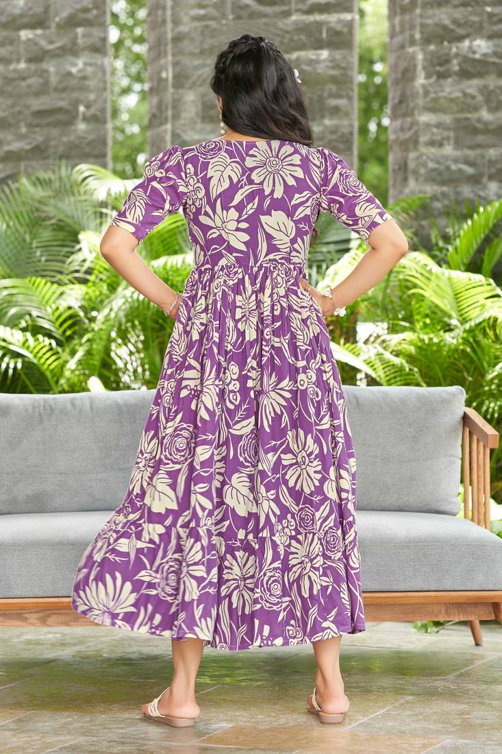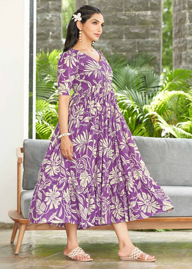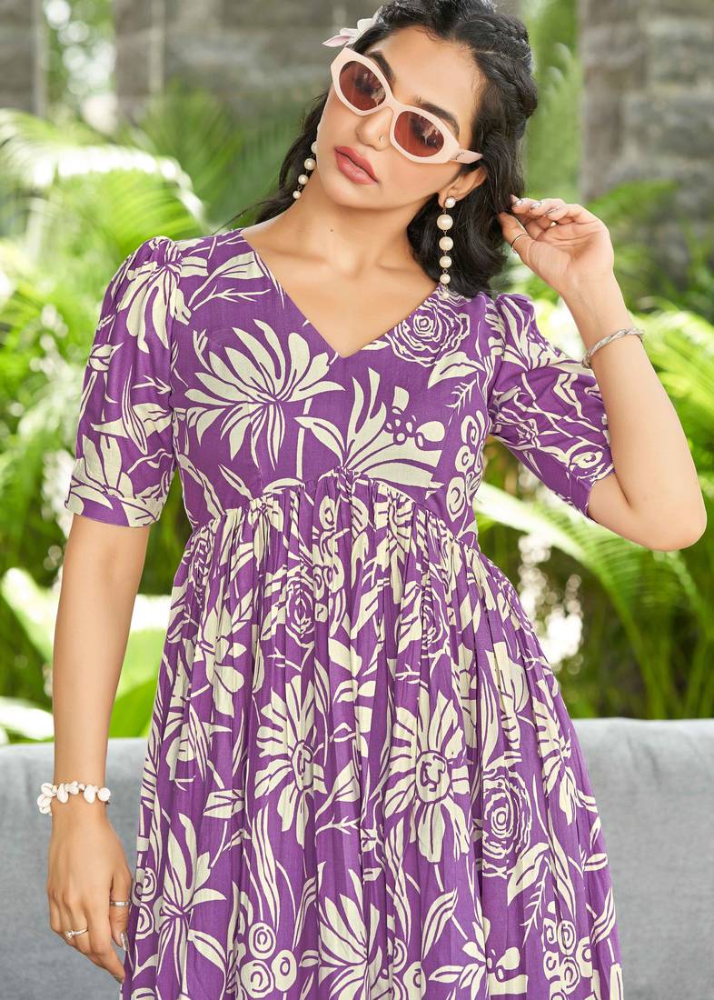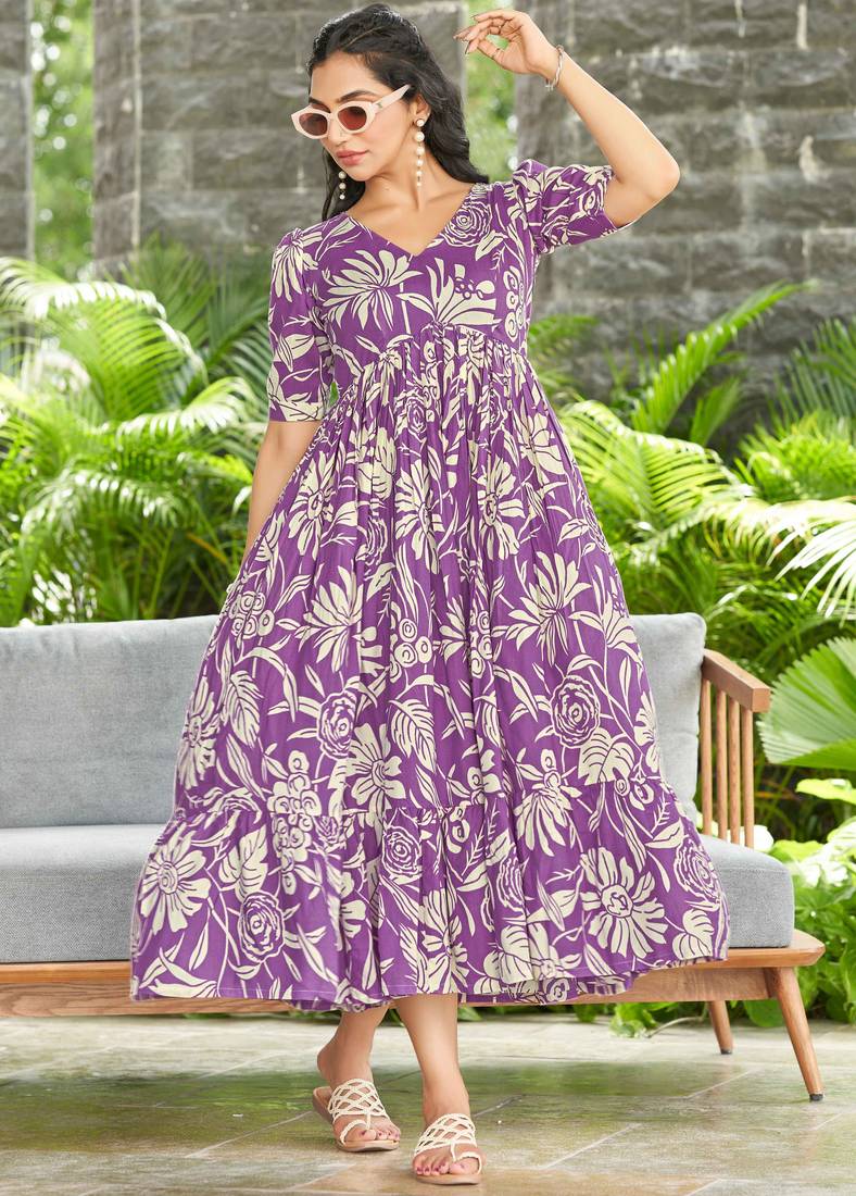 | Product Description | Add A Touch Of Elegance To Your Everyday Ethnic Collection With This Beautiful Purple Printed Flared Dress. Designed In A Soft And Breathable Fabric, This Dress Features A Flattering V Neckline And Comfortable Half Sleeves, Making It Ideal For All Day Wear. The Gathered Waistline Enhances The Silhouette, While The Flowy, Flared Hem Creates A Graceful And Feminine Appeal. The Rich Purple Base Paired With Contrasting All Over Prints Gives This Dress A Stylish Yet Traditional Look, Perfect For Casual Outings, Day Functions, Office Wear, Or Relaxed Festive Occasions. Easy To Style And Comfortable To Wear, This Dress Pairs Effortlessly With Ethnic Jewellery And Flats Or Sandals For A Complete, Polished Look. |