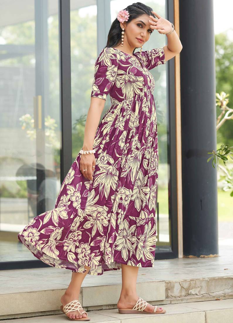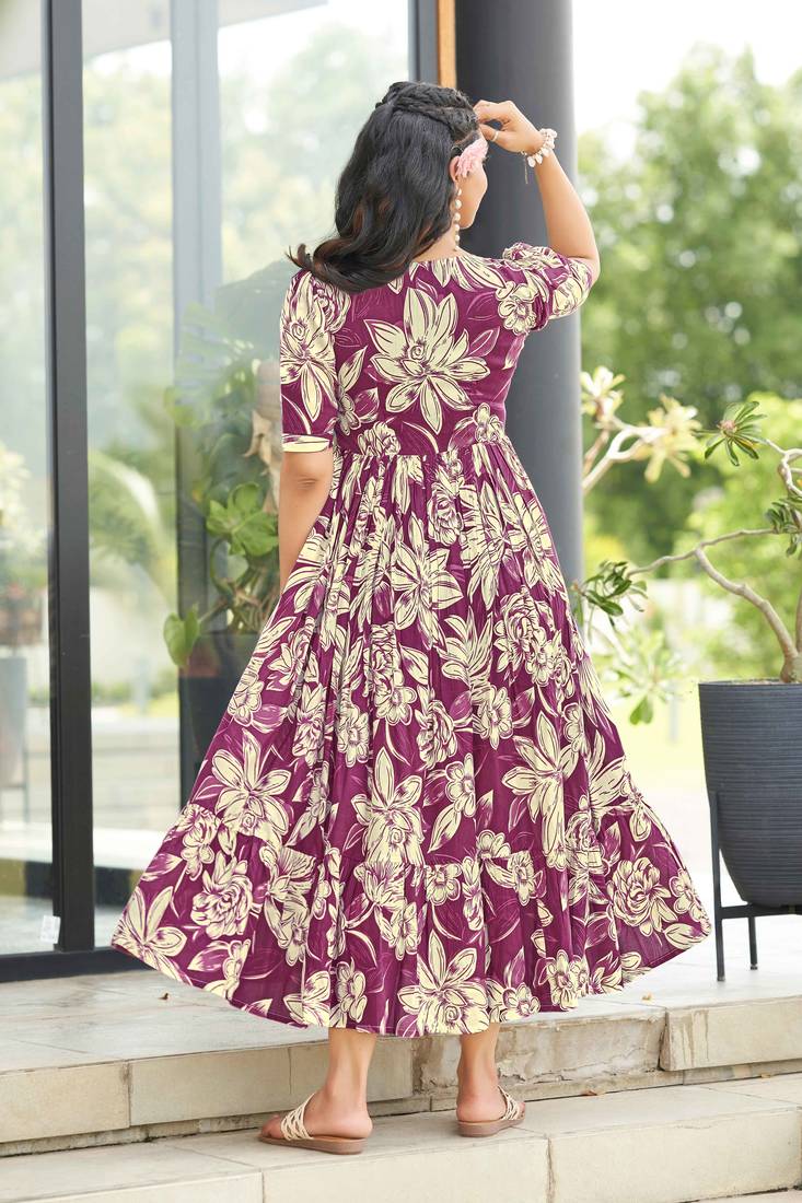 | Product Description | Step Into Effortless Elegance With This Rich Wine Purple Printed Flared Kurti Dress, Featuring A Striking All Over Floral Print That Adds A Bold Yet Graceful Appeal. Styled With A Flattering V Neckline And An Empire Waist, The Dress Flows Into A Beautifully Gathered, Tiered Silhouette That Offers Comfort, Movement, And A Flattering Fit. The Short Sleeves And Mid Calf Length Make It Perfect For All Day Wear, While The Soft, Breathable Fabric Ensures Ease And Comfort. Ideal For Casual Outings, Festive Daytime Occasions, Brunches, Or Relaxed Gatherings, This Kurti Dress Pairs Beautifully With Statement Earrings And Flats Or Heels For A Refined Ethnic Fusion Look. |