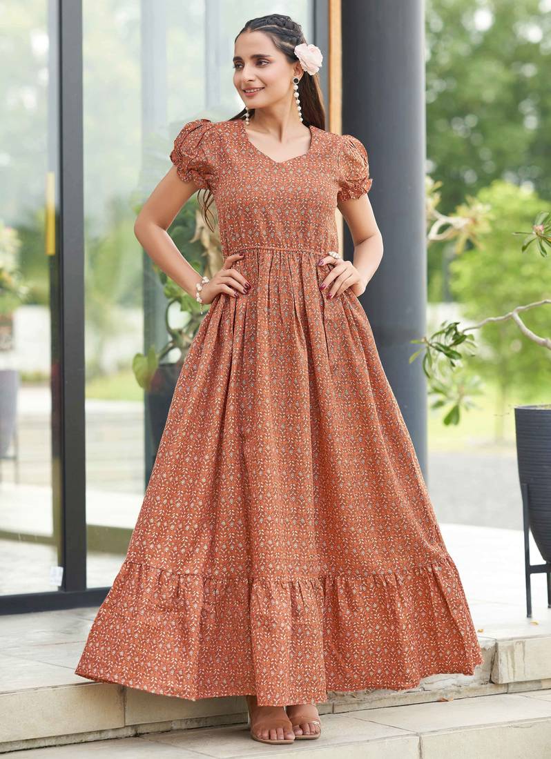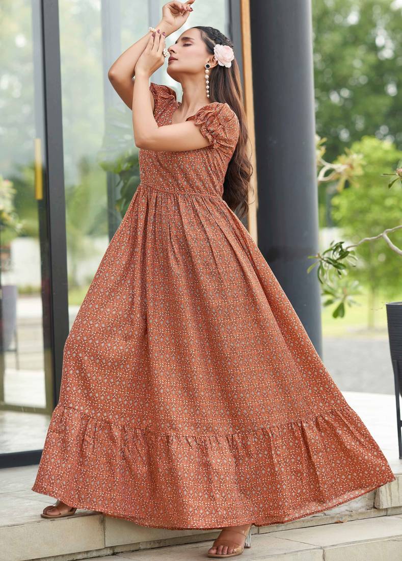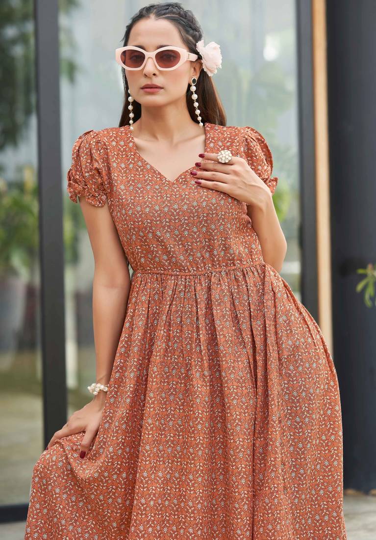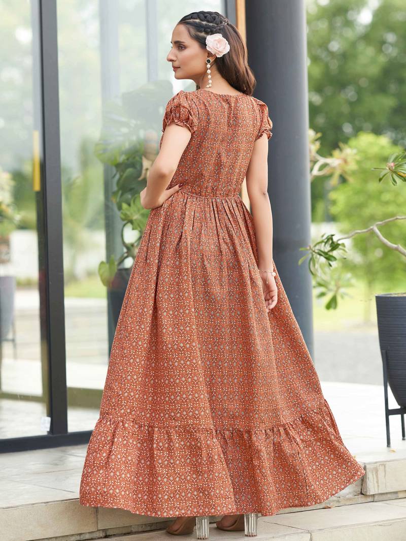 | Product Description | Refresh Your Ethnic Wardrobe With This Elegant Rust Brown Printed Maxi Dress, Designed For Effortless Everyday Style. Crafted In A Flowy Flared Silhouette, The Dress Features A Flattering V Neckline With Soft Gathers And Short Puff Sleeves For A Feminine Touch. The All Over Delicate Floral Buti Print Adds Traditional Charm, While The Elasticated Waist Offers A Comfortable And Flattering Fit. Ideal For Casual Wear, Festive Days, And Daytime Outings. |