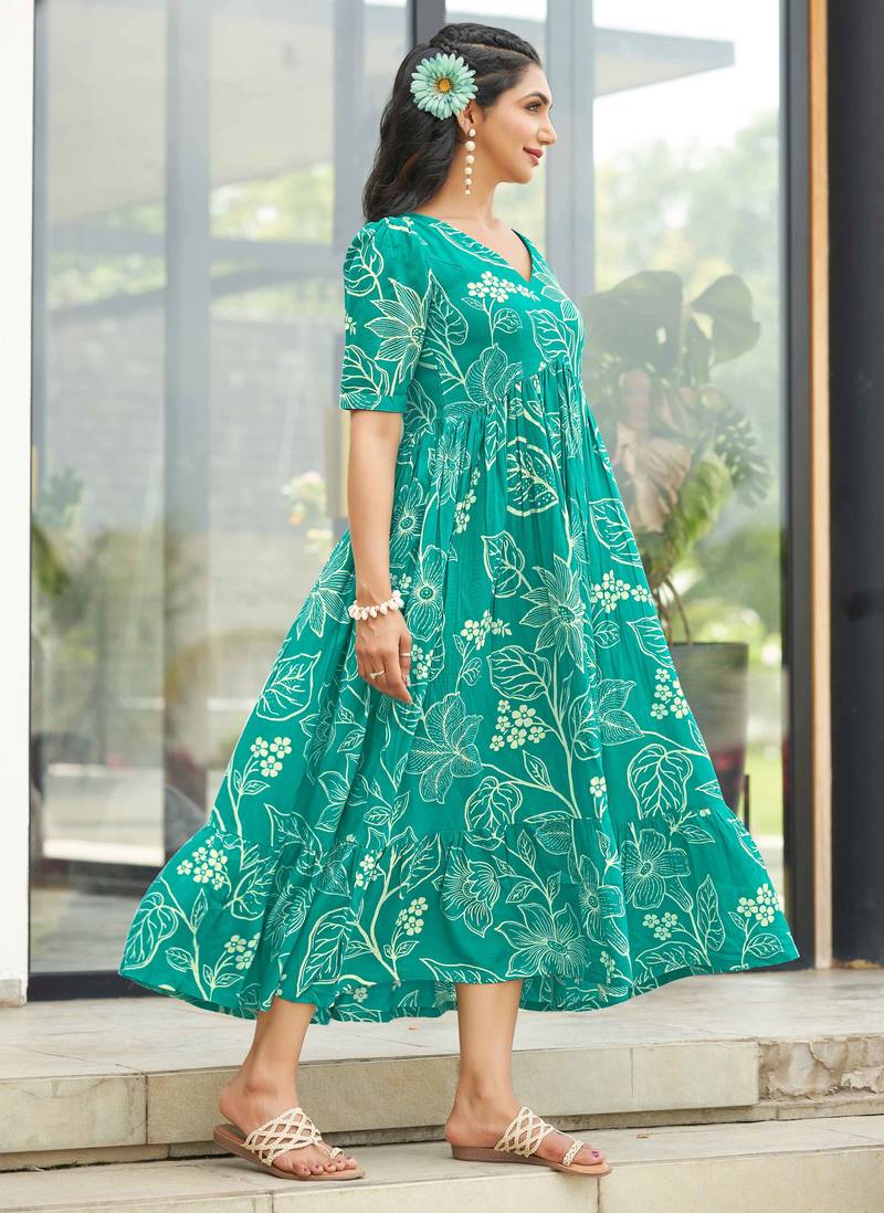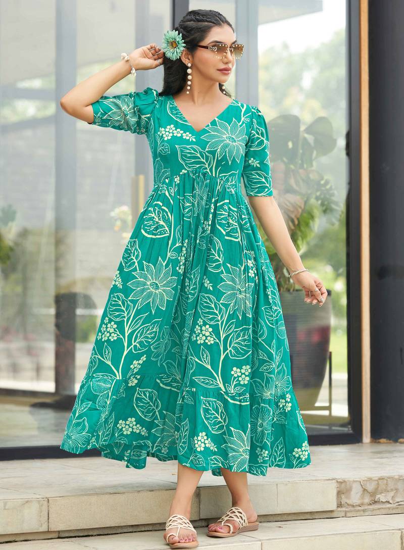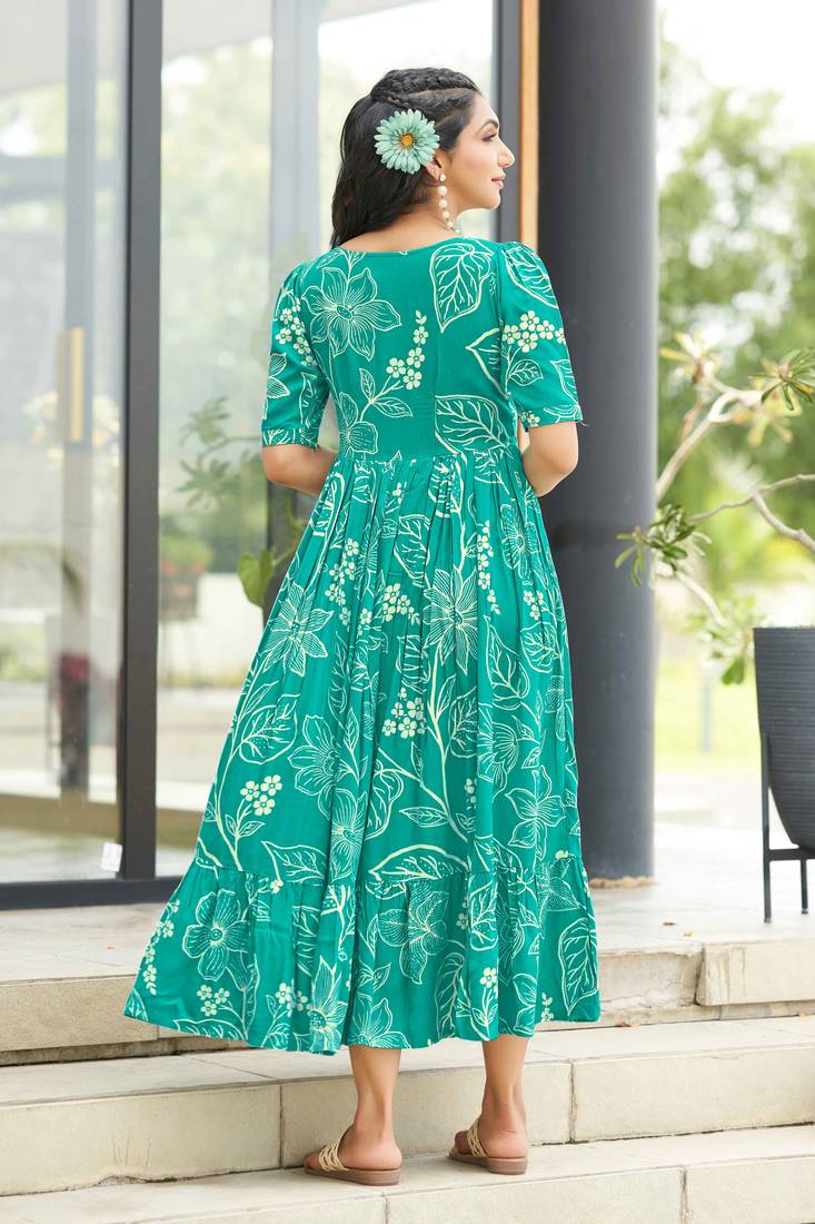 | Product Description | Add Effortless Charm To Your Ethnic Wardrobe With This Elegant Green Printed Flared Dress, Designed For Comfort And Graceful Everyday Styling. Crafted From Soft, Breathable Fabric, This Dress Features A Flattering V Neckline, Comfortable Half Sleeves, And A Gathered Waist That Creates A Flowy, Feminine Silhouette. The All Over Floral Print Enhances Its Fresh And Vibrant Appeal, While The Calf Length Flared Hem Offers Ease Of Movement And A Stylish Finish. Perfect For Casual Outings, Office Wear, Day Events, Or Relaxed Festive Occasions, This Dress Pairs Beautifully With Ethnic Jewellery And Flats Or Sandals For A Complete, Polished Look. |