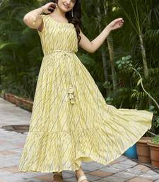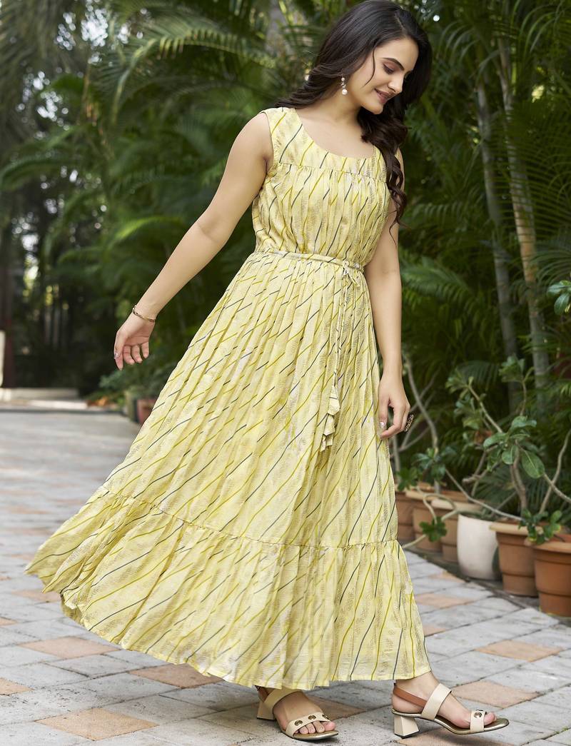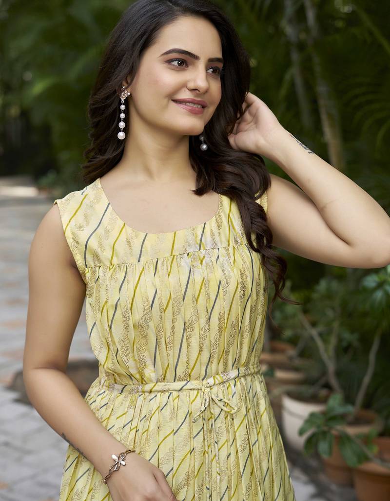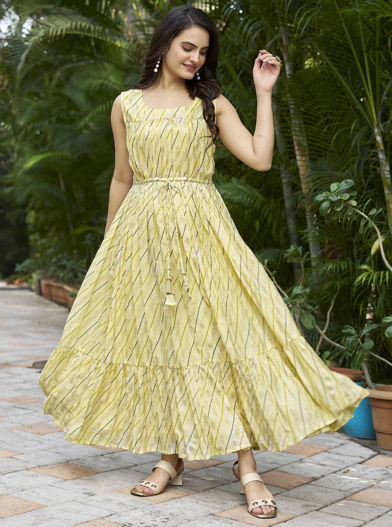 | Product Description | Brighten Your Ethnic Wardrobe With This Graceful Yellow Printed Maxi Dress, Designed In A Flattering Flared Silhouette. Featuring A Stylish Square Neckline And A Functional Tie Up Waist, This Dress Offers Both Comfort And Elegance. The Soft All Over Print And Flowy Tiered Hem Make It A Perfect Choice For Festive Occasions, Daytime Outings, And Casual Celebrations. |