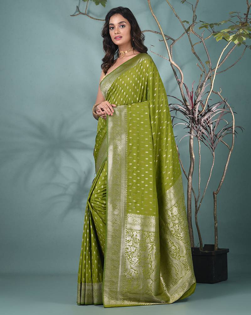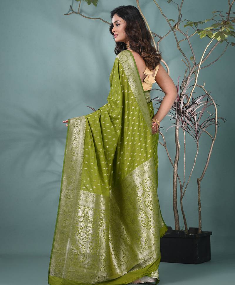 Elegant green georgette saree with intricate silver zari work
