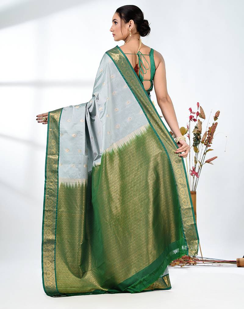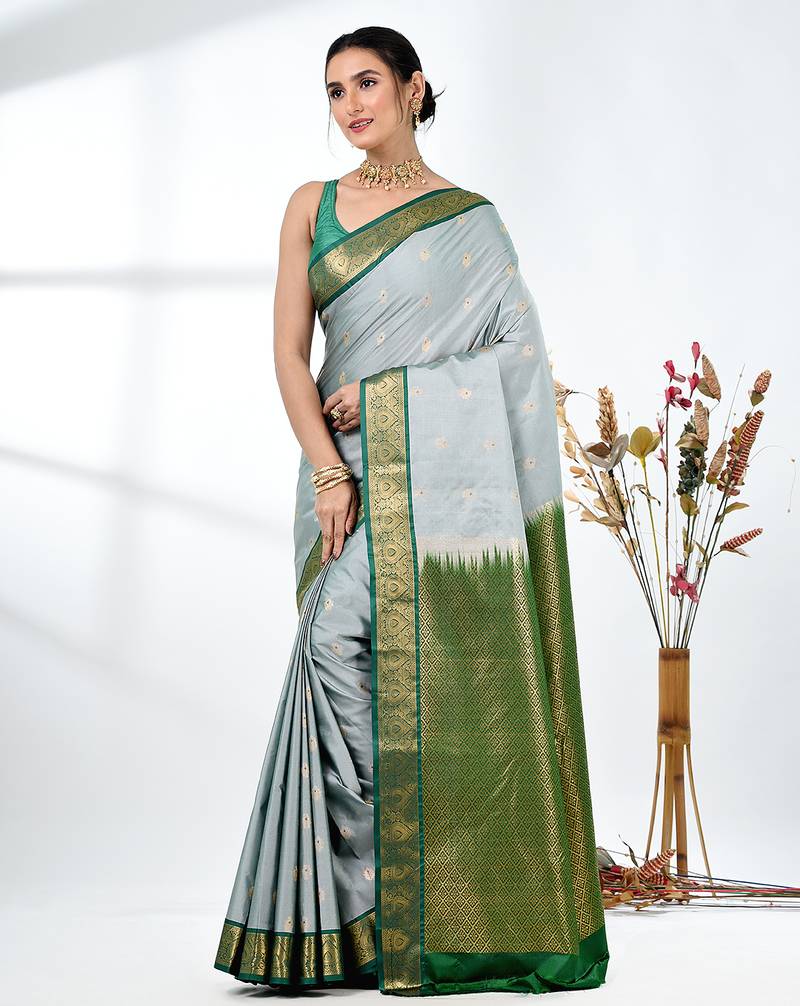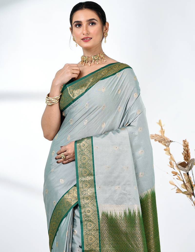 | Product Description | This Enchanting Mint Green Pure South Silk Saree Exudes Grace And Sophistication, Perfect For Elegant Occasions. The Soft Pastel Green Shade, Complemented By A Rich Green And Golden Zari Border, Creates A Timeless And Regal Look. The Fine South Silk Fabric Ensures A Luxurious Feel And Comfortable Drape, Ideal For Weddings, Festivals, And Special Celebrations. The Saree Is Beautifully Detailed With Golden Zari Floral Motifs, Adding An Intricate Touch Of Tradition. The Contrast Of The Green Pallu And Border Adds Depth And Allure, Making This Saree A Showstopper At Any Event. |