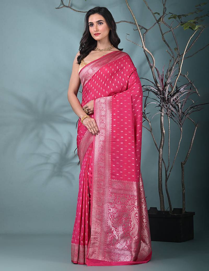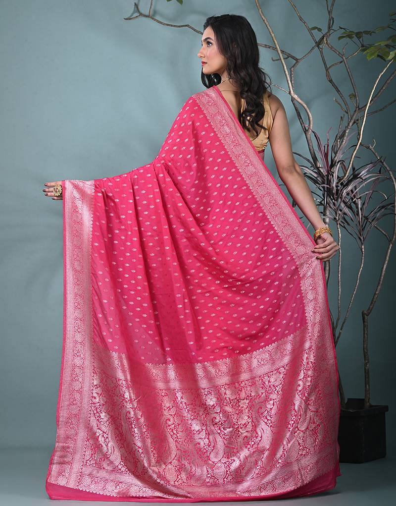 | Product Name | Elegant Pink Georgette Saree With Intricate Silver Zari Work | |