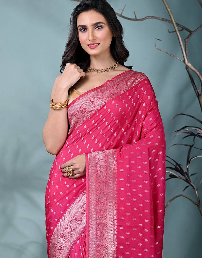| Product Description | Elevate Your Elegance With This Exquisite Pink Georgette Saree, Designed For Every Special Occasion. The Soft, Flowing Georgette Fabric Ensures A Comfortable And Flattering Drape, While The Subtle Pink Hue Adds A Touch Of Grace. The Saree Is Beautifully Enhanced With Intricate Silver Zari Work Along The Borders, Creating A Stunning Contrast That Adds Sophistication And Charm. This Saree Comes With A Matching Blouse Piece, Making It A Complete Ensemble For Your Next Festive Or Wedding Event. Perfect For Traditional Celebrations, Receptions, Or Upscale Gatherings, This Saree Exudes Timeless Beauty And Understated Luxury. |