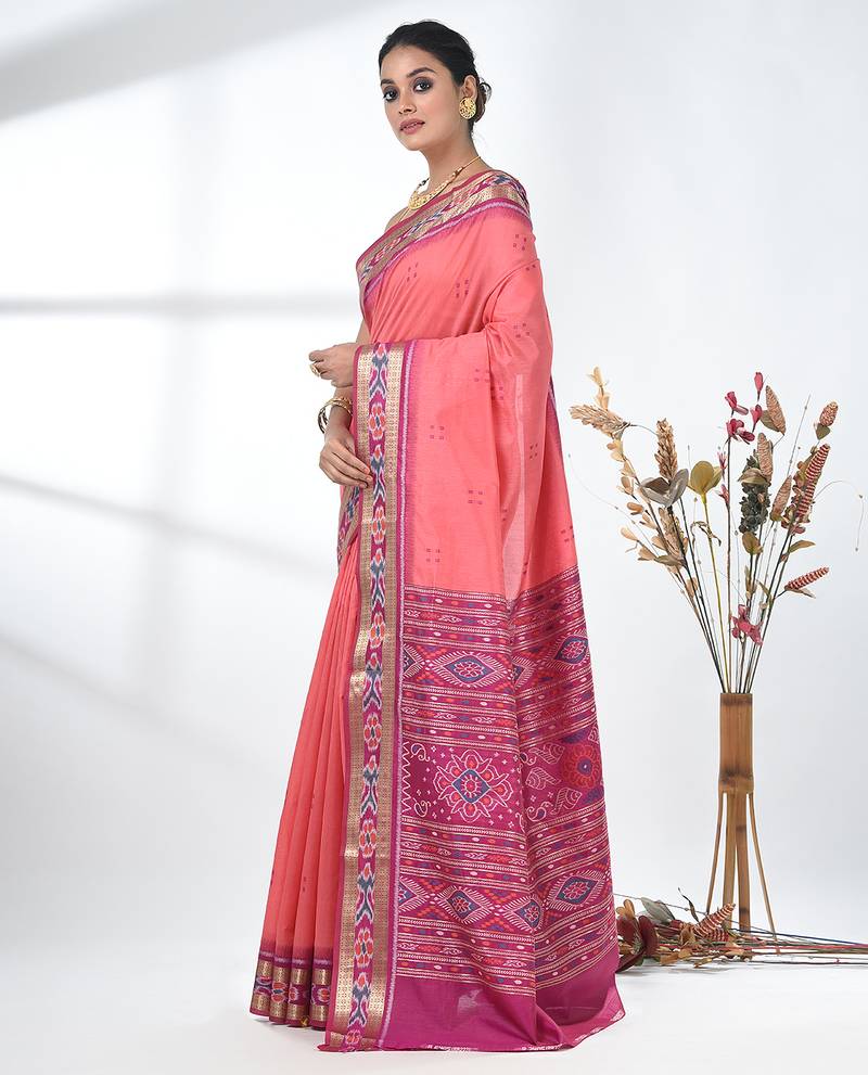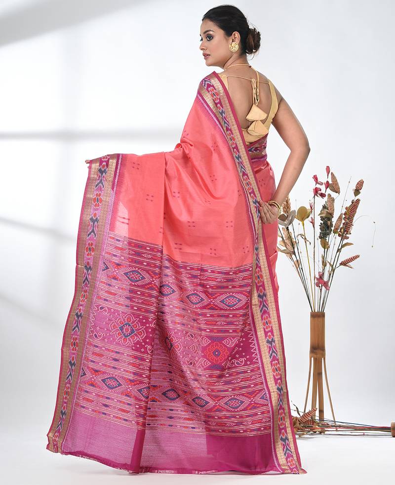 Elegant pink tussar silk blend saree with sambhal puri ikat border