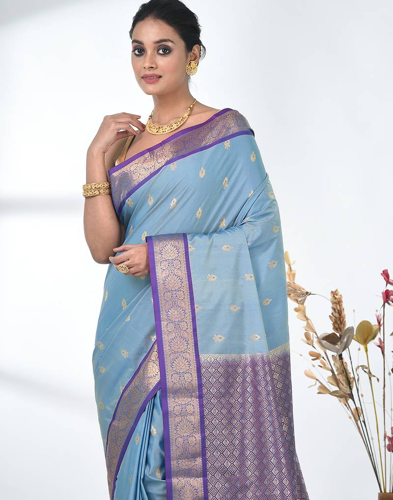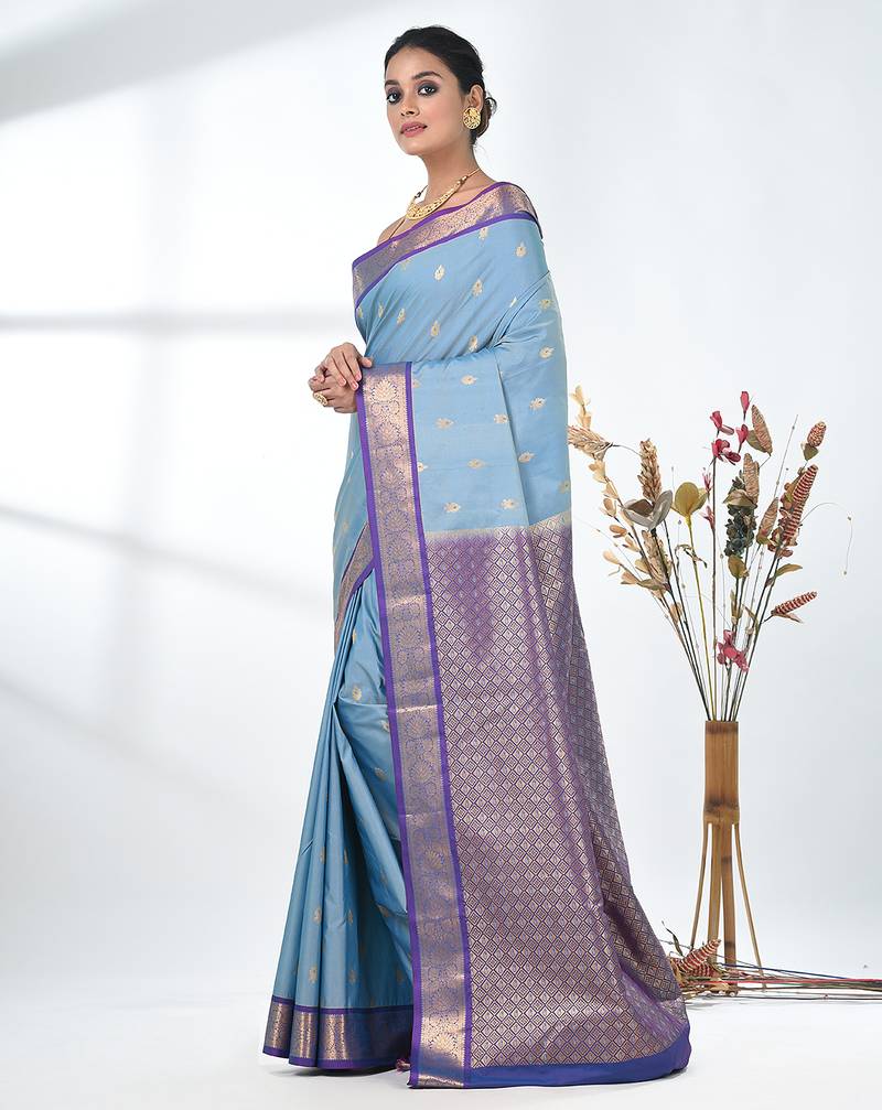 | Product Description | This Enchanting Sky Blue Pure South Silk Saree Exudes Grace And Sophistication, Perfect For Elegant Occasions. The Soft Pastel Blue Shade, Complemented By A Rich Purple And Golden Zari Border, Creates A Timeless And Regal Look. The Fine South Silk Fabric Ensures A Luxurious Feel And Comfortable Drape, Ideal For Weddings, Festivals, And Special Celebrations. The Saree Is Beautifully Detailed With Golden Zari Floral Motifs, Adding An Intricate Touch Of Tradition. The Contrast Of The Purple Pallu And Border Adds Depth And Allure, Making This Saree A Showstopper At Any Event. |