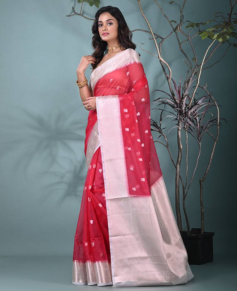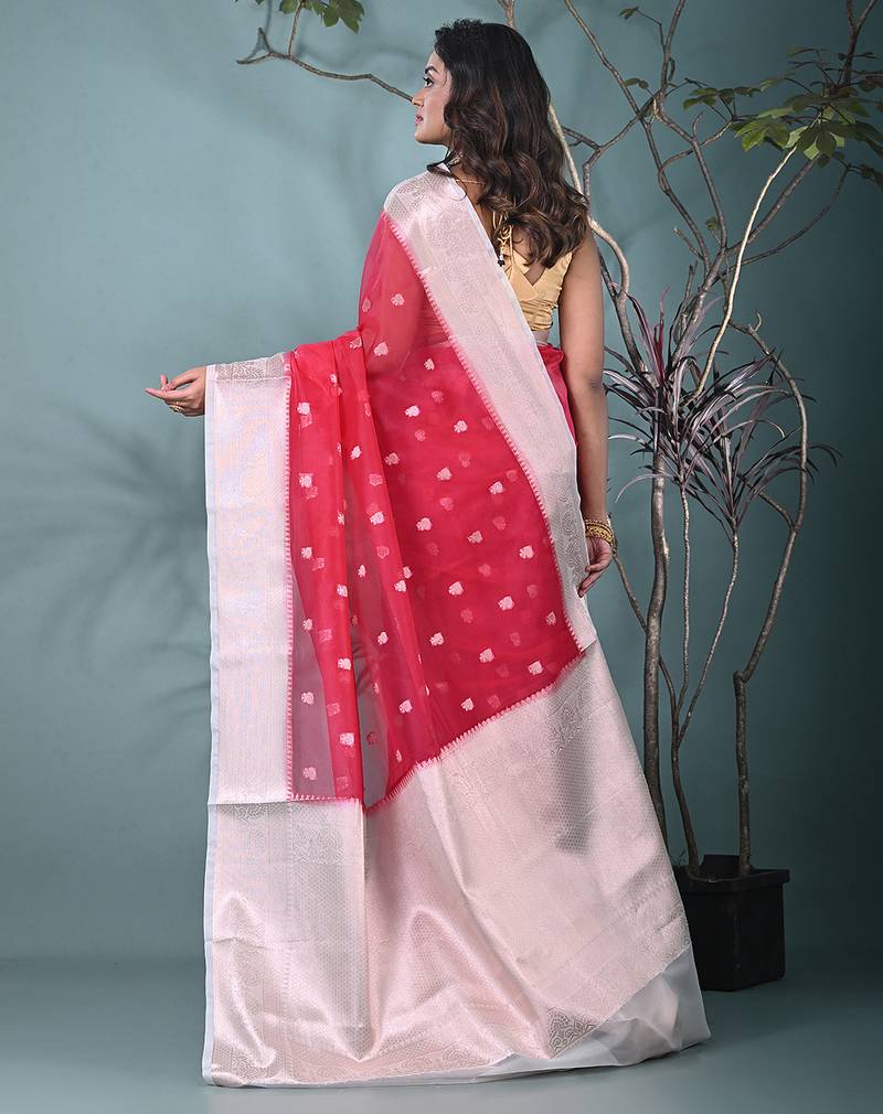 | Product Description | This Exquisite Saree Is Crafted From Premium Organza Fabric, Offering An Elegant And Lightweight Feel. The Rich Fuchsia Color Serves As A Stunning Backdrop For Delicate Floral Motifs, Intricately Woven Into The Fabric, Adding A Touch Of Sophistication. The Saree Is Bordered With A Contrasting White Shade, Beautifully Accentuating Its Refined Design. Its Soft Sheen Creates A Mesmerizing Visual Appeal, Making It Perfect For Special Occasions Such As Weddings, Festive Celebrations, Or Evening Events. |